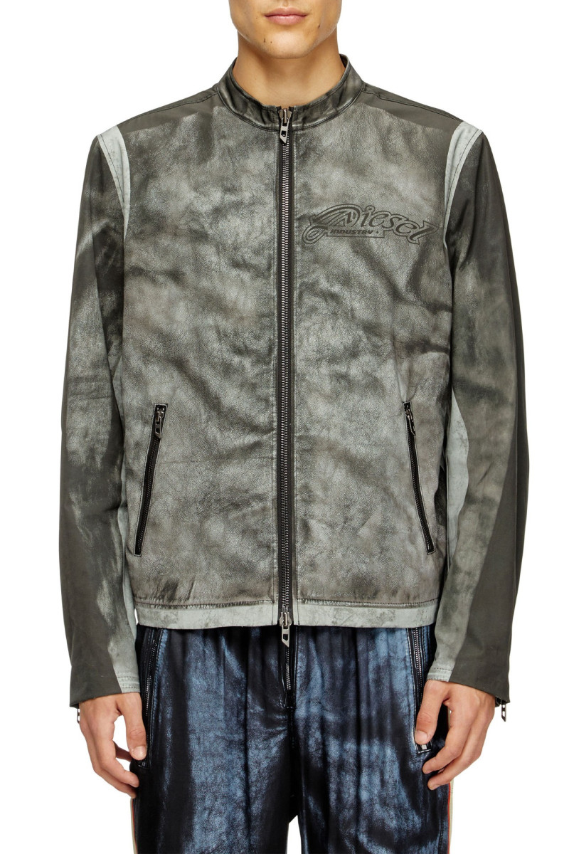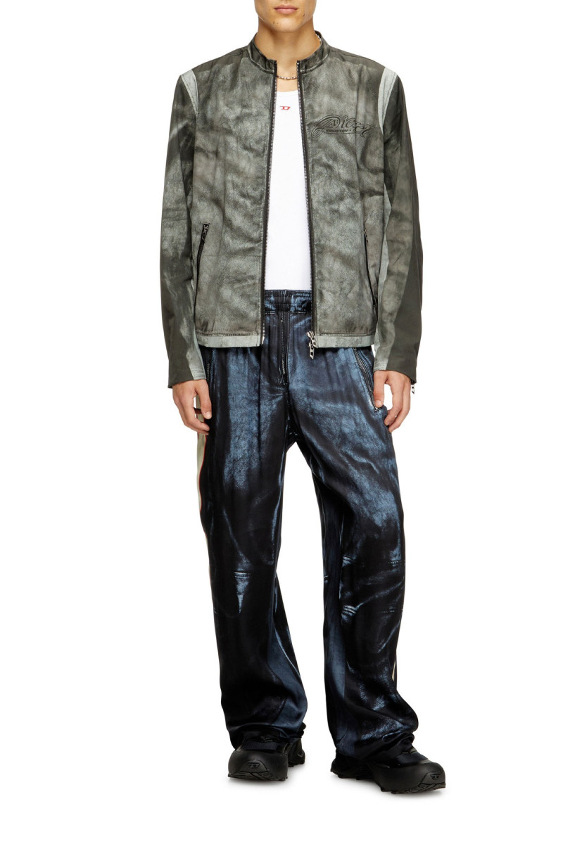 Pánská biker bunda. Regular rovný volnější střih do pasu. Tento originální model působí, jako by byl vyroben z vybledlé černé kůže, ve skutečnosti je z potištěného plátna z bavlny a nylonu. Speciální úprava laserovou metodou Trompe l"oeil doplňuje motorkářský styl. Stojáček u krku na druk. Na zádech je zdobena potiskem 78, který odkazuje na rok založení značky Diesel. Zapínání na obousměrný zip. Manžety a kapsy na zip. Model má na sobě velikost IT 48 a měří 188 cm.