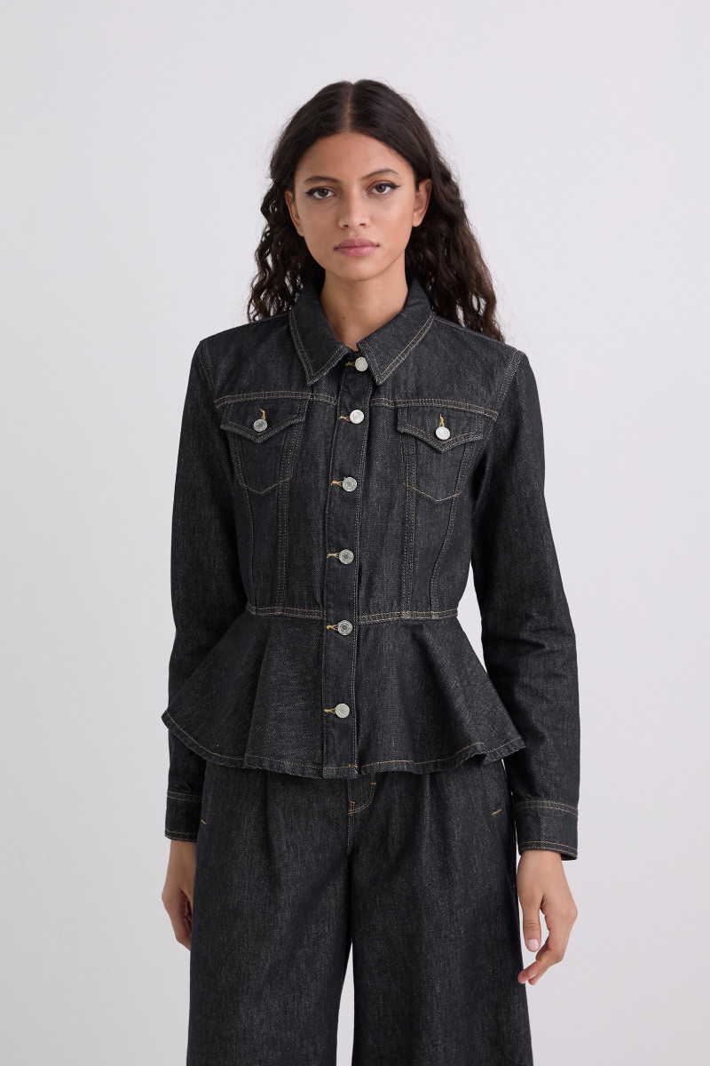 Dámská džínsová bunda přiléhavého střihu. Elegantní design s košilovým límcem u krku a zapínáním na knoflíky doplňuje romantický vlnitý spodní lem a náprsní kapsy. Odolná denimová tkanina s 100% podílem prémiové bavlny je pevná, ale nošením se stává krásně přizpůsobivou, měkkou a velmi příjemnou na dotek. Skvěle kombinovatelný kousek v moderním střihu, který skvěle doladí každý váš ležérní outfit.