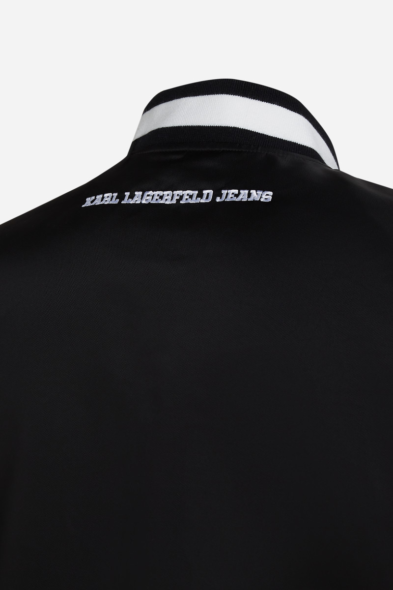 Pánská bunda bomber stříhu s charakteristickými náplety kolem krku, pasu a rukávů. Zapínání na dvoucestný zip, dvě boční šikmé kapsy. Celý design doplňují vyšité iniciály loga Karl Lagerfeld Jeans na hrudi a vyšité logo na zádech. Svrchní materiál tvoří velmi lehká a na dotek příjemně měkká nylonová tkanina, která je však pevná, odolná a snadno se udržuje. Stylový kousek, který vkusně a velmi nápaditě oživí váš ležérní styling.