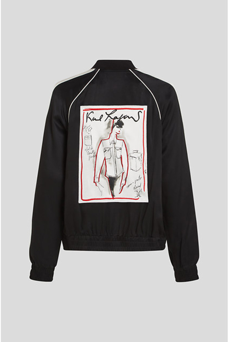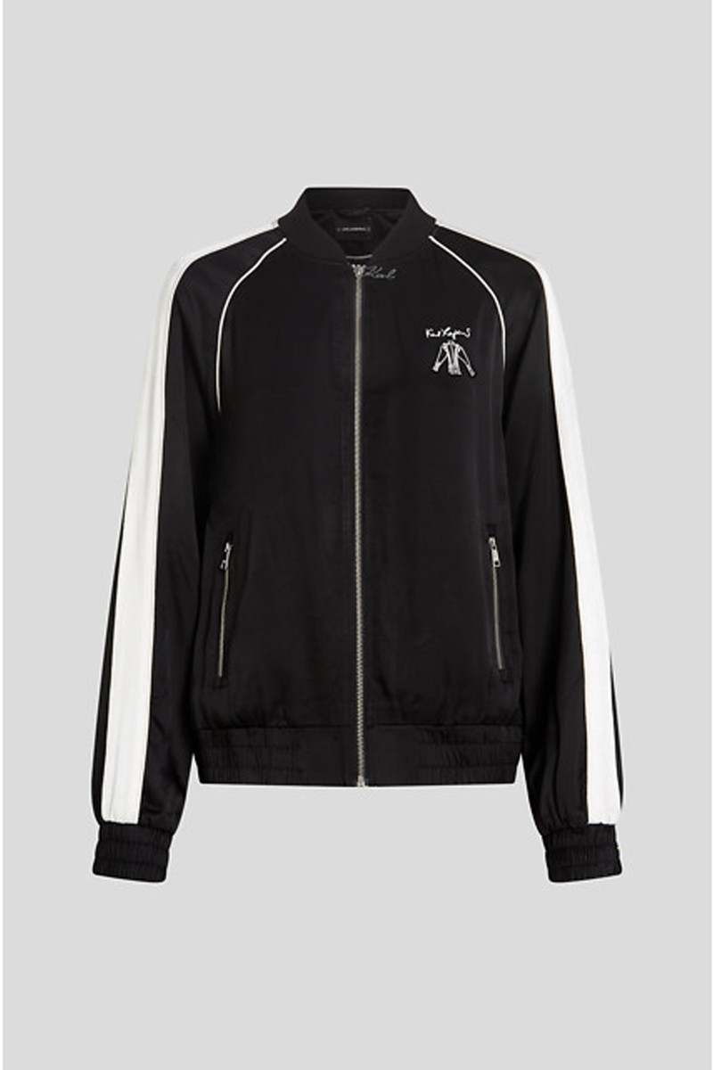 Dámská saténová bunda v bomber stylu. Černo-bílé lemování je doplněno archivními skicami Karla Lagerfelda na hrudi a na zádech. Uvolněný design se spuštěnými rameny doplňují tonální lemy u krku, v pase a na rukávech. Nechybí boční šikmé kapsy na zip. Materiálové složení zaručuje dokonalou lehkost a příjemný pocit při nošení. Výborně kombinovatelný kousek v moderním střihu, který stylově doladí jakýkoliv outfit.