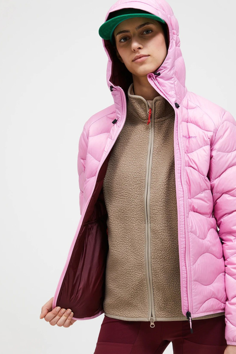 Dámská prošívaná péřová bunda se zapínáním na zip a kapucí. Rovný střih s mírně prodlouženými zády doplňuje logo značky vyšité na hrudi a rukávu, kapuce se stahovací šňůrkou, elastické rukávy a boční panely z hřejivého úpletu pro maximální prodyšnost a pohodlí během každého pohybu. Bunda má elastický lem na rukávech a v pase, poutka na zádech, otevřené boční kapsy a přední náprsní kapsu na zip, která vám umožní vzít si s sebou menší věci, aniž by vás omezovala v pohybu. Kvalitní výplň z kachního peří v poměru 90/10 se zárukou kontrolovaného ekologického původu ze zodpovědných zdrojů, které jsou dohledatelné s pomocí programu Track My Down® a s plnivostí 700 CUIN vás udrží v teple. Složení materiálu zajišťuje příjemnou hřejivost, lehkost a vynikající skladnost na cestách díky snadnému sbalení. Vyrobeno z maximálně lehkého materiálu, recyklovaného polyamidu bez PFC, který má vodoodpudivou a větruodolnou úpravu. Velmi praktický kousek pro celoroční použití, který lze pohodlně nosit i jako základní vrstvu pod bundu nebo sportovní kabát.