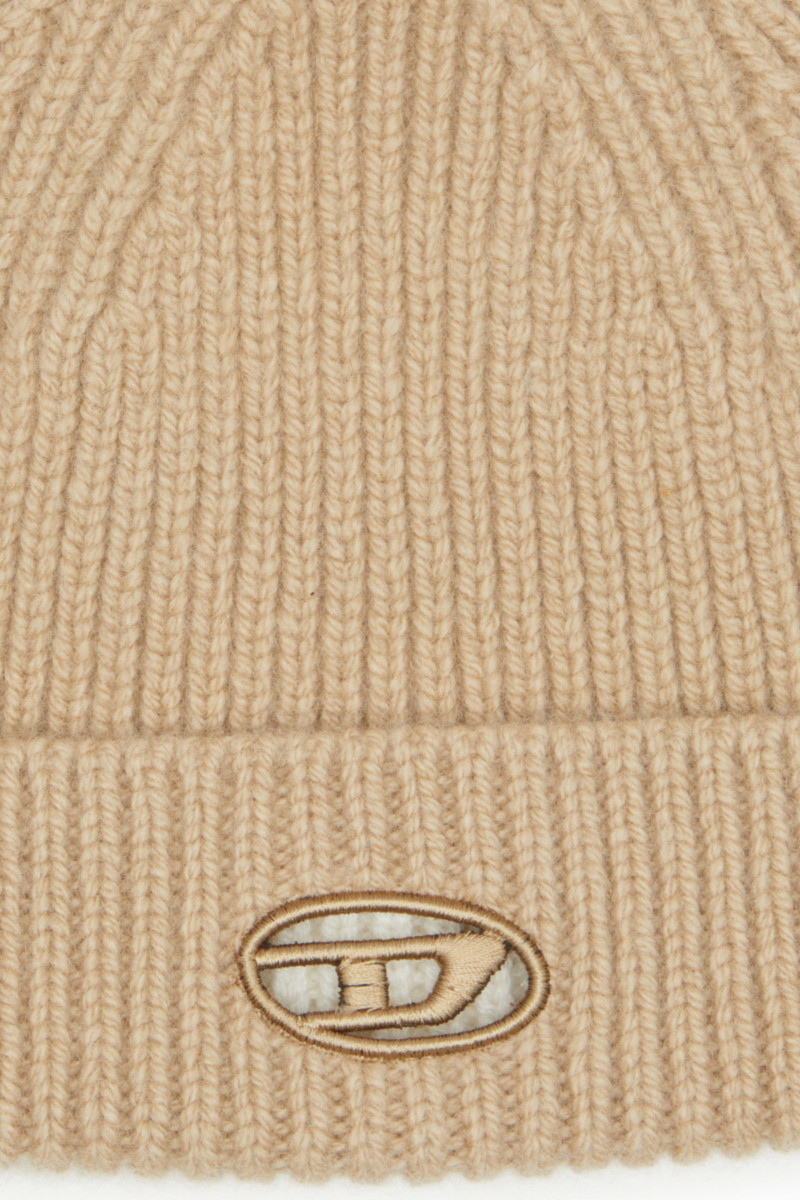 Pletená čepice. Vyrobena z luxusní úpletové směsi vlny a kašmíru. Je vyrobena z žebrování o síle 5 gauge a pohodlně padne na hlavu. Na střední části manžety zdobena vyšitým logem ikonického Oval D oválnou výšivku ve tvaru D, která je decentním, ale zároveň připomínajícím Diesel. Unisex. Ohrnovací lem.