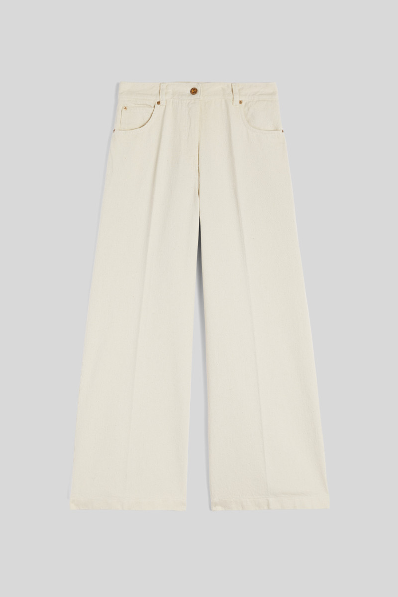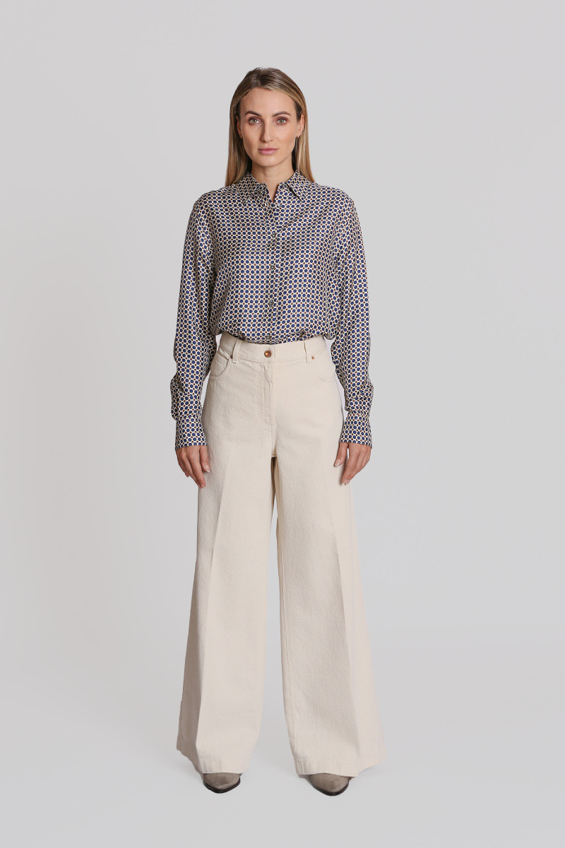 Dámské denimové kalhoty s širokými nohavicemi. Jednobarevný design s vysokým pasem, pěti kapsami a poutky na opasek doplňuje zapínání na knoflík a zip. Odolná tkanina se 100 % podílem prémiové bavlny zaručuje měkkost, prodyšnost a maximálně příjemný pocit při nošení. Dokonale stylový kousek, který skvěle doladí váš sportovně-elegantní outfit.
