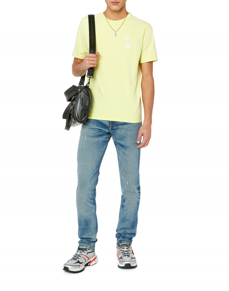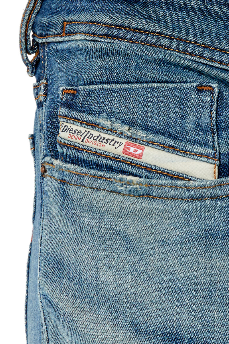 Pánské strečové džíny. Skinny fit úzký dobře padnoucí střih s nízkým pasem. Nohavice je zúžená od stehna směrem ke kotníku. Design navržený s ohledem na punk-rockový styl. Viditelné stínované efekty a oděrky definují tento strečový denim, vyvedený ve středně modrém odstínu. Zapínání na zip. Detail kontrastního červeného loga písmene ,,D" vyšitého na zadní kapse. Model má na sobě velikost 32 a měří 188 cm.