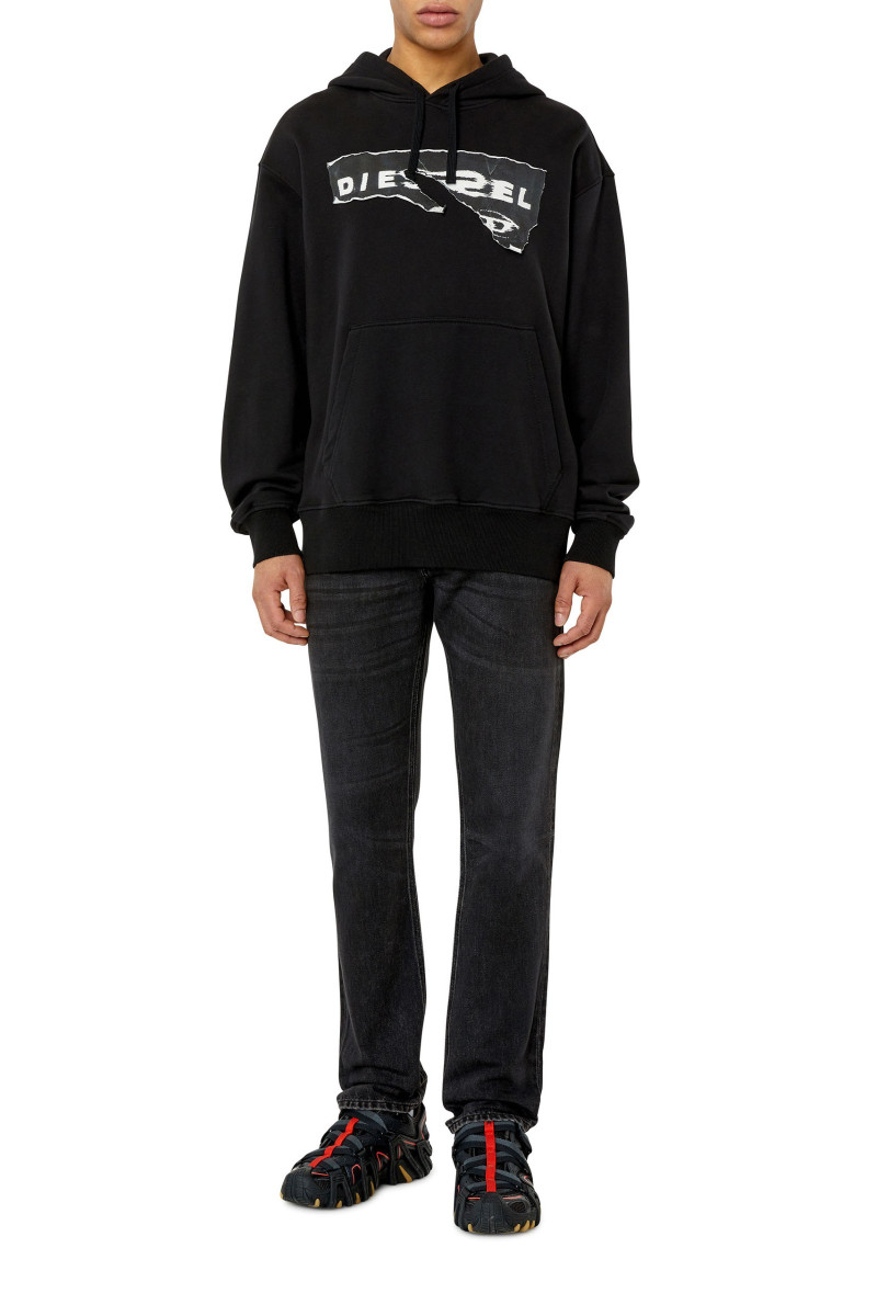 Pánské úzké džíny. Střih se středně vysokým pasem a rovnou nohavicí. Tento model, inspirovaný techno hudbou poloviny 90. let, má originální vzhled Diesel. Čistě černý wash vyrobený z pevného denimu. Zapínání na knoflíky. Model má na sobě velikost 31 a měří 182 cm.