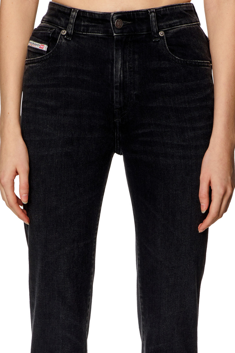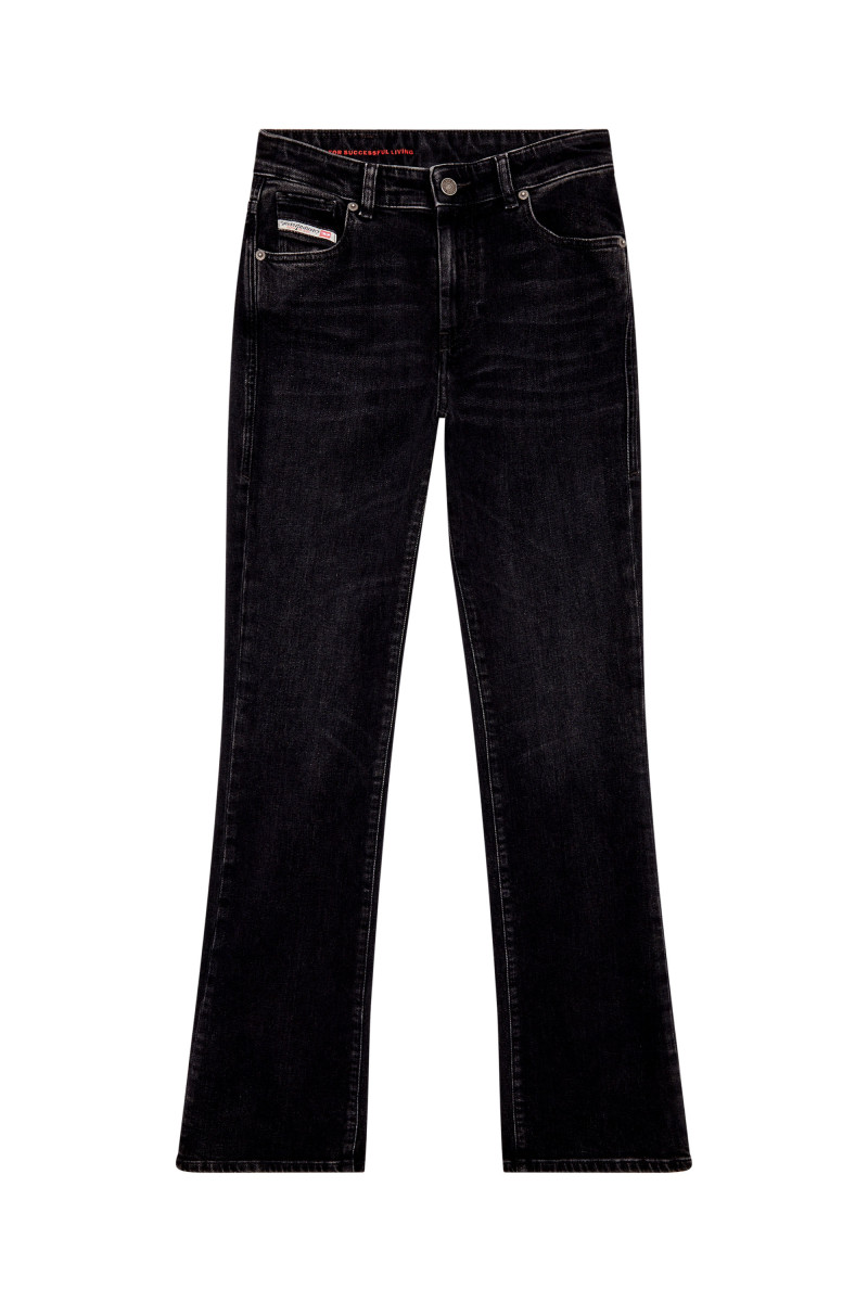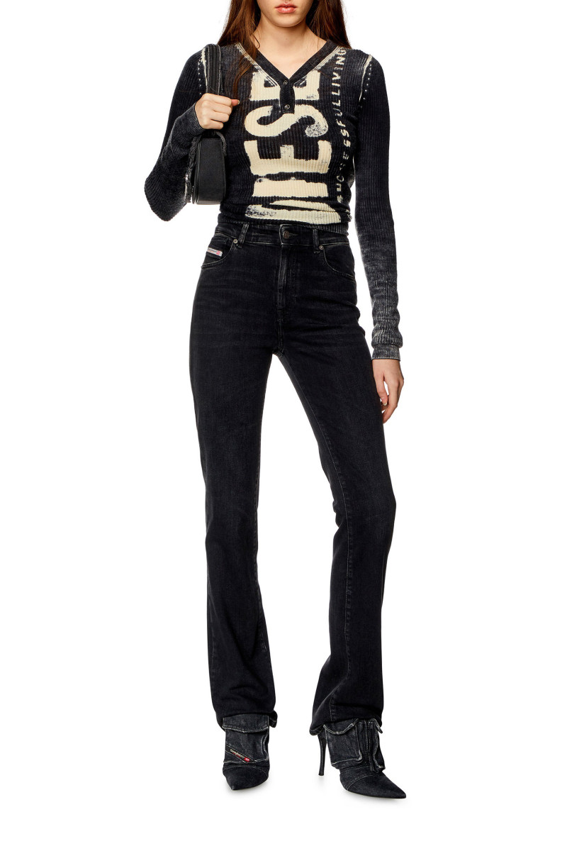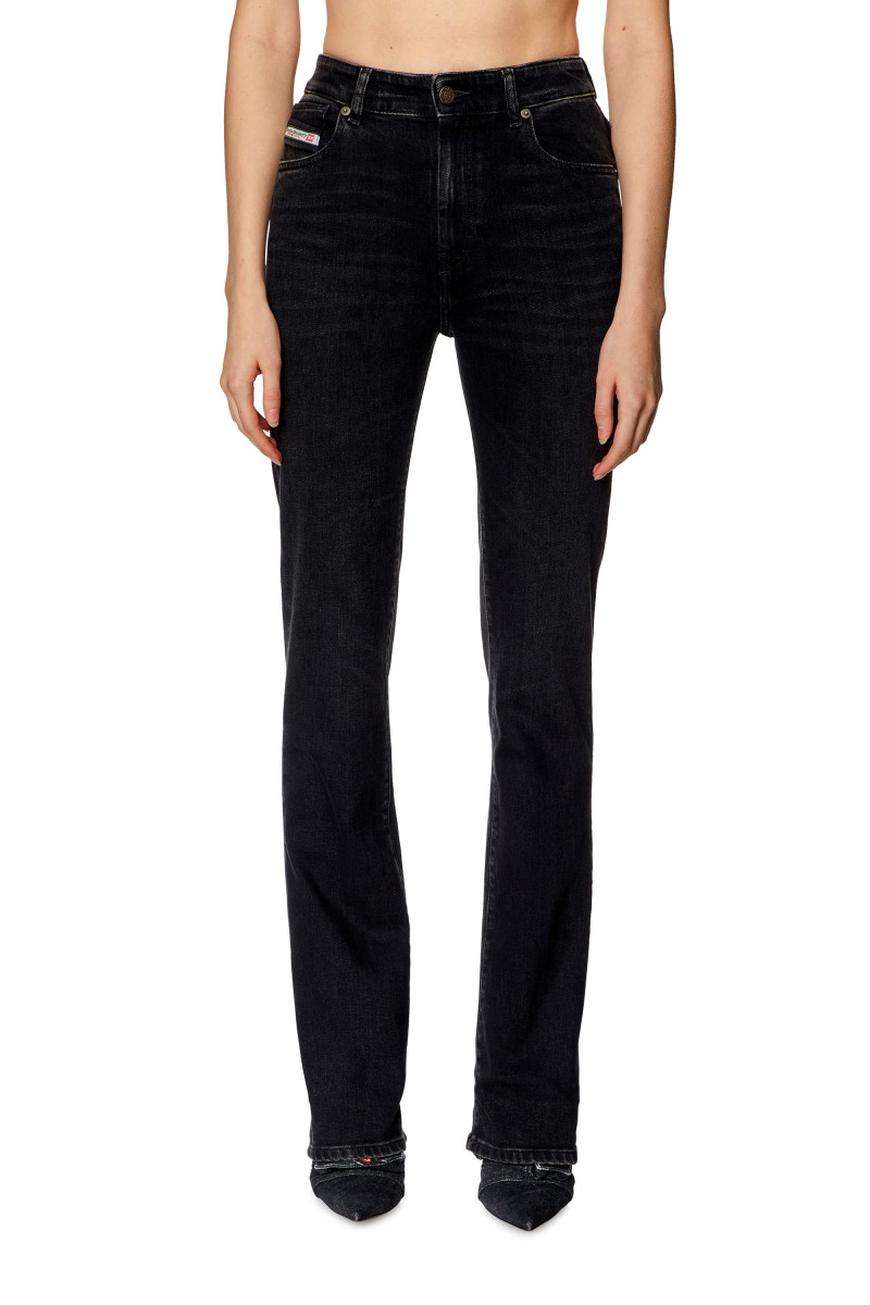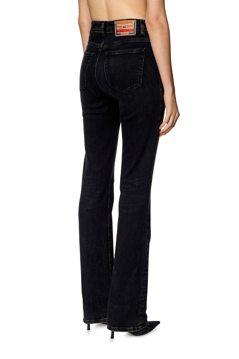 Dámské džíny ve stylu bootcut s vysokým pasem a úzkou nohavicí s mírným rozšířením na konci. Střih je definován rovnou konstrukcí v horní části džínů, která vytváří moderní siluetu. Design s pěti kapsami, poutky na pásek a zapínáním na zip doplňuje ikonická značka Diesel Industry našitá na zadní straně. Tento čistý černý komfortní denim, vyrobený z částečně recyklované bavlny s náznakem streče, je jemně upravený a vytváří přirozeně použitý vzhled. Model má na sobě velikost 26 a měří 175 cm. Velikost odpovídá skutečnosti, zvolte si, prosím, svou běžnou velikost.