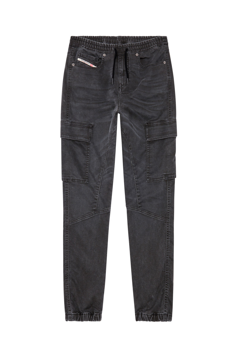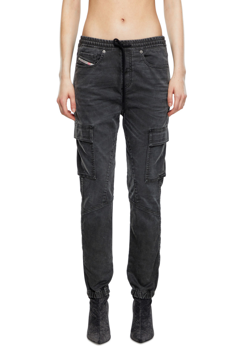 Dámské džíny s pravidelným pasem a úzkými nohavicemi, vyrobené z materiálu JoggJeans pro maximální pohodlí. Džíny mají cargo siluetu s našitými kapsami na stehnech a elastickou šňůrkou v pase. Detailně zdobené červeným vyšívaným písmenem D. S modifikovaným šedým praním, které je součástí výběru základních praní DNA značky Diesel. Modelka má na sobě velikost 26 a měří 175 cm. Velikost odpovídá skutečnosti, zvolte si, prosím, svou běžnou velikost.