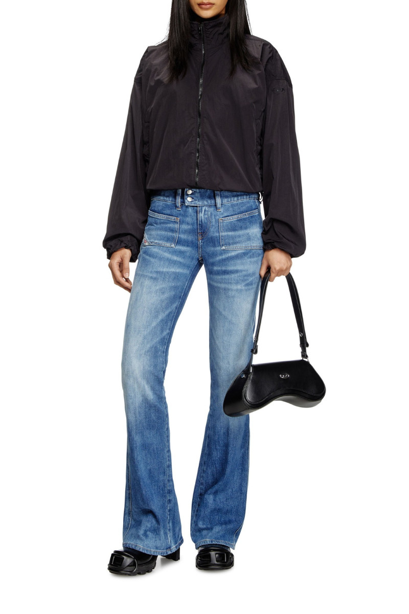 Dámské džíny bootcut střihu s úzkými nohavicemi, které se od kolen dolů rozšiřují. Jednobarevný design se středně vysokým pasem, předními našitými kapsami a poutky na opasek doplňují dvě našité kapsy s koženým štítkem umístěné na zadním díle. Odolná denimová tkanina je měkká, prodyšná a velmi příjemná na dotek. Příměs kvalitního elastanového vlákna je zárukou pružnosti a maximálního pohodlí během nošení. Výborně kombinovatelný kousek v moderním střihu, který skvěle doladí váš outfit.