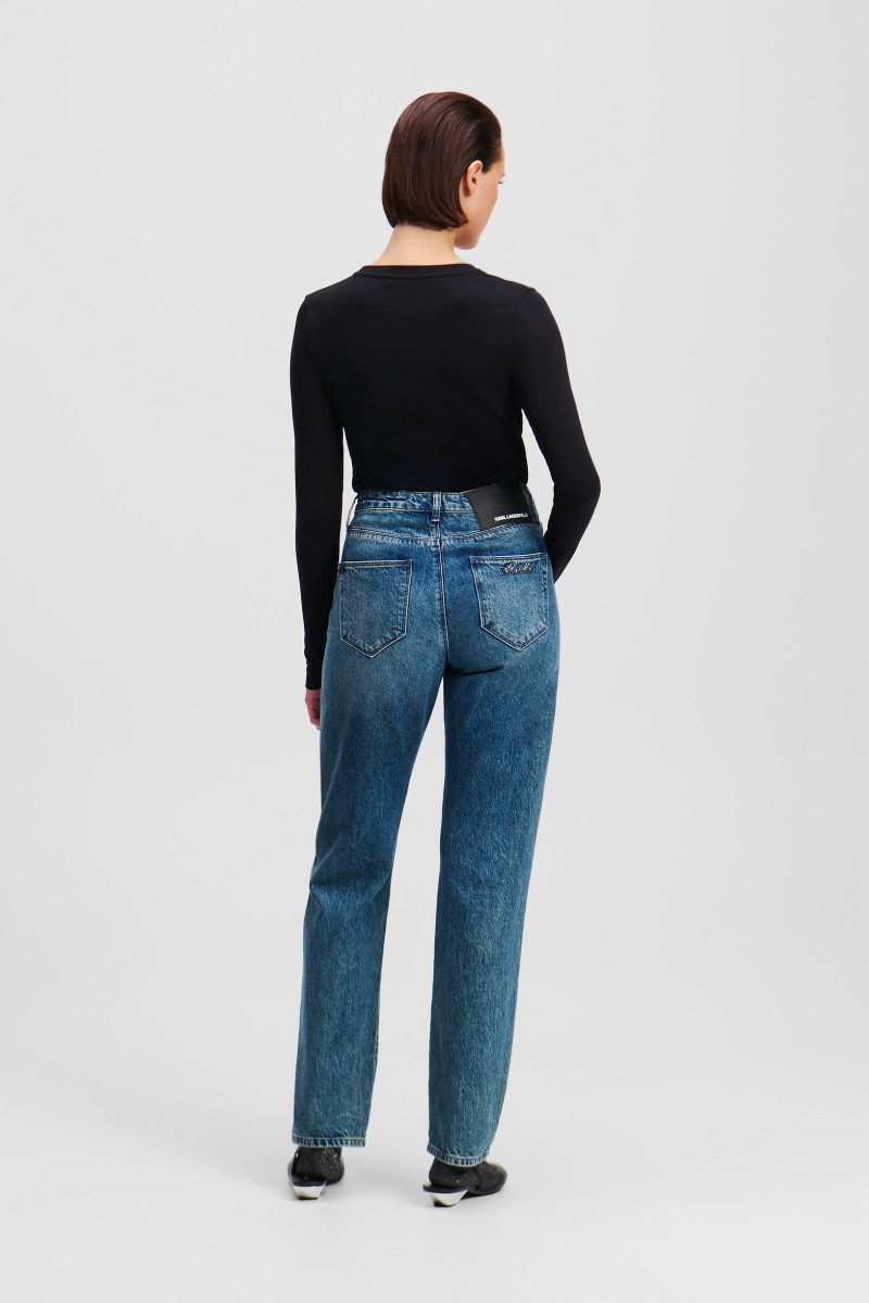 Dámské džínové kalhoty s rovným střihem nohavic. Mírně sepraný design s volným pasem a středvně vysokým sedem, pěti kapsami a poutky na pásek doplňuje elegantní kovové logo Karl Signature na zadní kapse. Směs prvotřídní bavlny a kvalitního lyocellu v mírně nižší gramáži dodává pocit mimořádné měkkosti a pohodlí. Skvělý kombinovatelný kousek, který stylově doplní váš ležérní outfit.