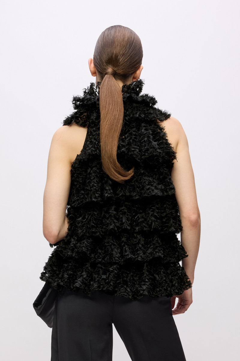 Dámský top bez rukávů s elegantním vysokým výstřihem. Exkluzivní design tvořený kaskádovými vlnami, které jsou vytvořené jemnou síťovanou vrstvou. Zapínání na knoflíky vzadu u výstřihu. Materiálové složení tvořené syntetickým vláknem zaručuje dokonalou pružnost a příjemný pocit při nošení. Nezaměnitelně stylový kousek, který vyzdvihne každý váš outfit a s nímž budete nepřehlédnutelná.