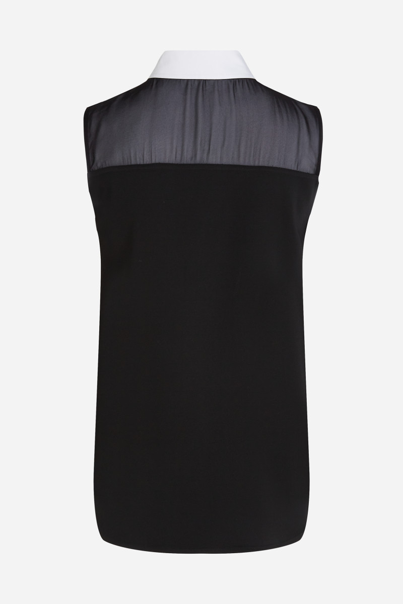 Dámská blůza bez rukávů s průhledným vrchním dílem a výrazným bílým popelínovým límcem. Úzký střih s elegantními knoflíky s logem KARL Autograph dodává rafinovaný vzhled. Krásně splývavé složení materiálu zaručuje dokonalou prodyšnost, jemný lesk a mimořádně příjemný pocit při nošení. Nezaměnitelně stylový kousek, který bude ozdobou vašeho denního i večerního outfitu.