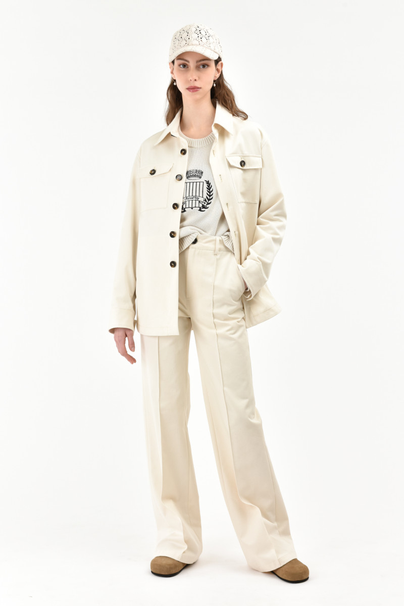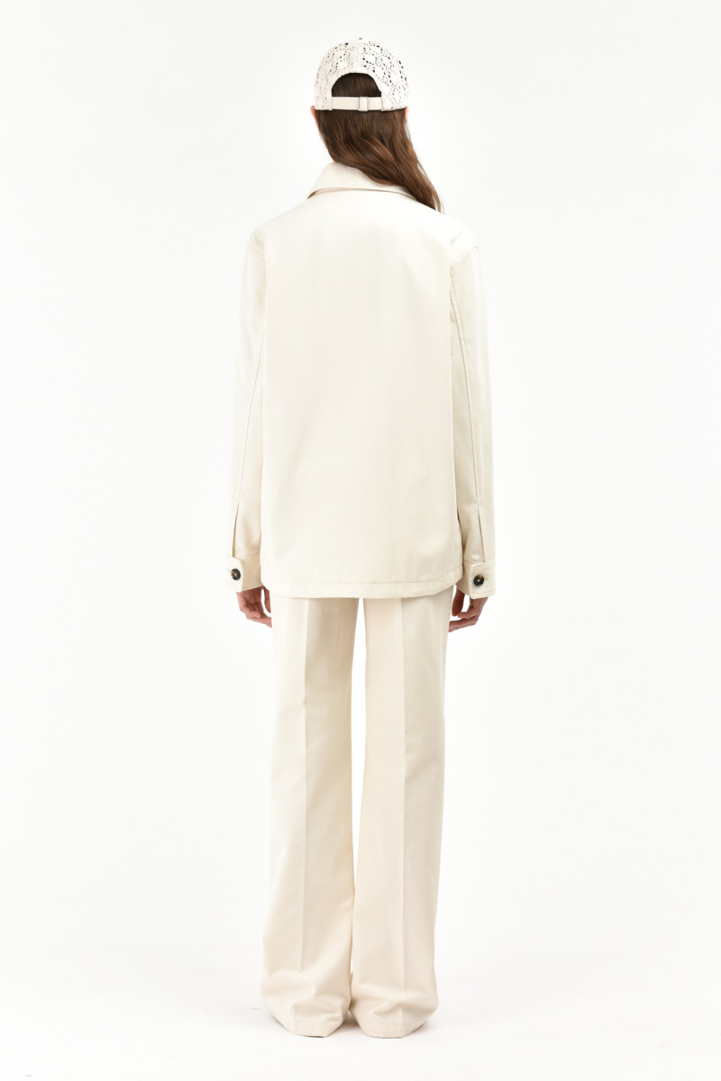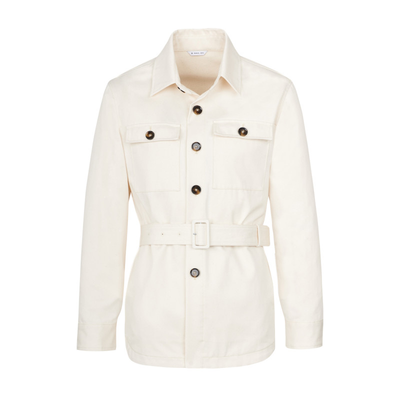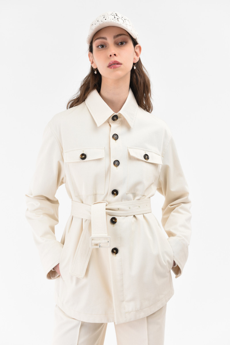Dámský kabát v košilové siluetě. Volný střih s plátěným opaskem. Tento nadčasový kousek je ušitý z kepru utkaného z recyklované bavlny. Klasické zapínání a manžety na knoflíky. Doplněn dvěma kapsami na knoflíky vpředu a dvěma na bocích. Modelka je vysoká 176 cm a nosí velikost 40.