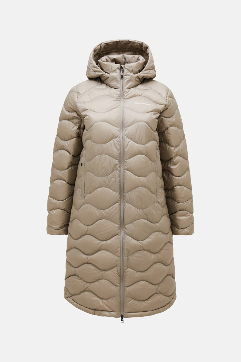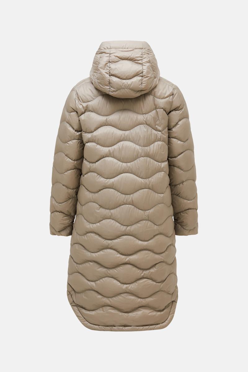Dámský prošívaný peřový kabát s kapucí. Oversized střih doplňuje brand logo vyšité na hrudi a kvalitní výplň z kachního peří se zárukou kontrolovaného, ekologického původu vysledovatelného prostřednictvím programu Track My Down® v poměru 90/10. Dalšími prvky jsou odnímatelná nastavitelná kapuce, elastický lem na rukávech, prakticky řešené kapsy na zip a poutko na zádech. Vynikající skladnost na cestách díky jednoduchému sbalení. Kabát je vyroben z recyklovaného polyamidu bez obsahu PFC, který je velmi lehký, větruodolný a vodoodpudivý. Velmi praktický kousek pro celoroční využití, který si zamilujete.