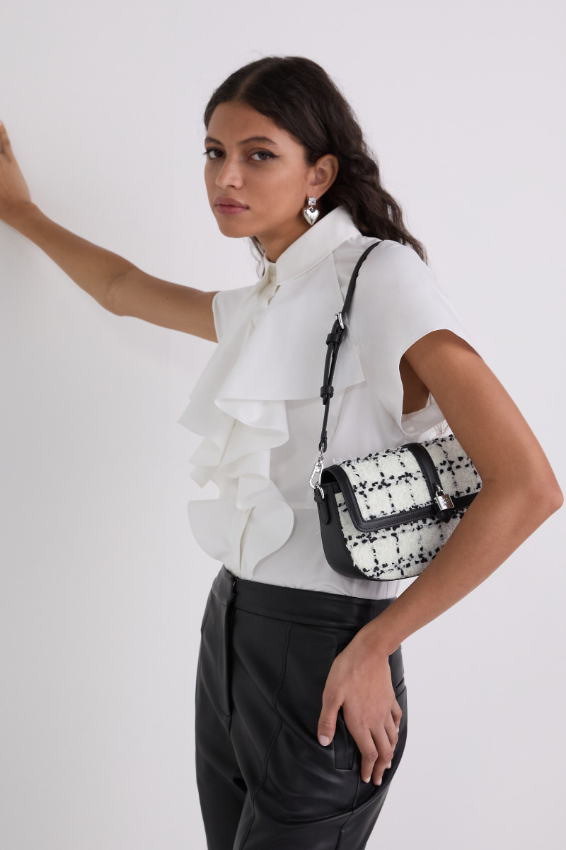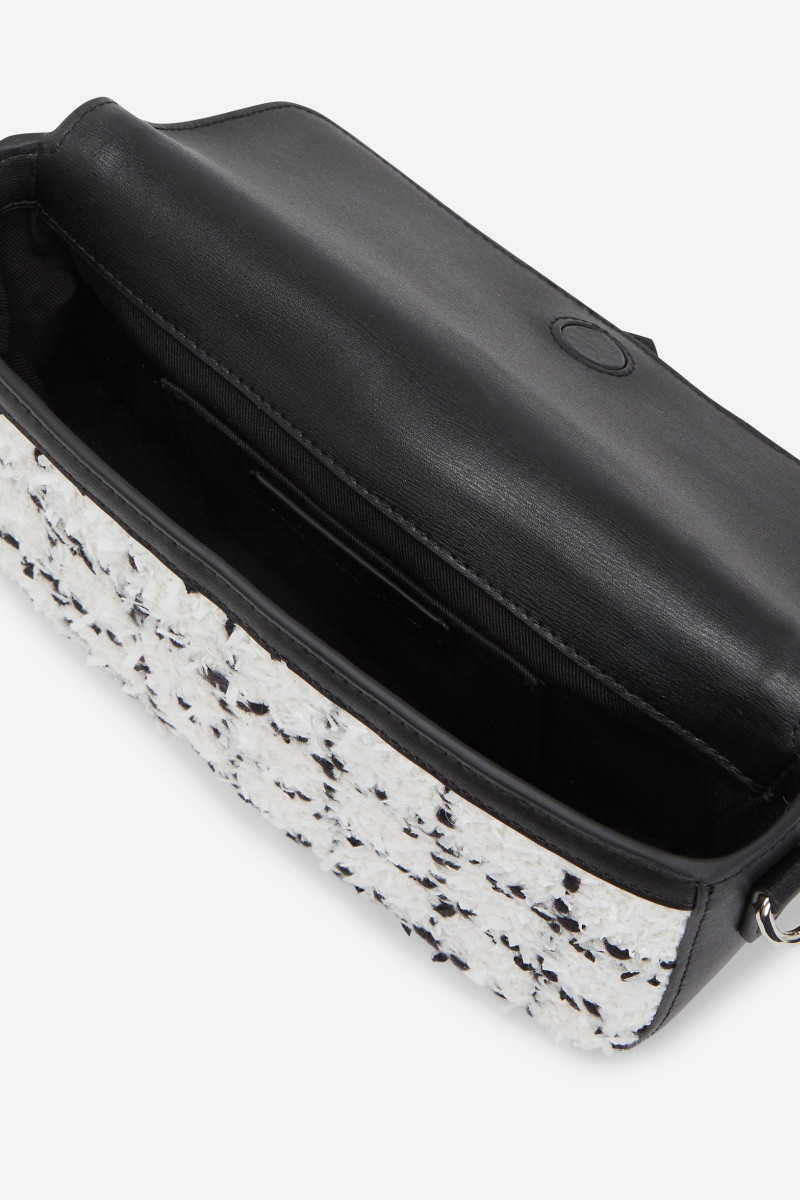 Dámská crossbody kabelka, která vás okouzlí svým exkluzivním vzhledem a univerzálním využitím. Celoplošný design v elegantní bouclé tkanině je doplněn jemným zámkem s vyrytým nápisem loga Karl Autograph. Součástí je také odnímatelný a nastavitelný popruh. Prostorný interiér s praktickou kapsou je doplněn klopou se zapínáním na magnetickou klapku. Dokonale stylový a praktický kousek, který dodá vašemu outfitu eleganci a sofistikovanost.