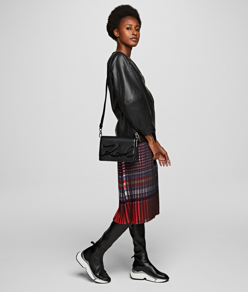 V kompaktní kabelce s kovovou plaketkou na klopě, kterou zdobí ikonický podpis Karla Lagerfelda, se snoubí elegance s vynikajícím designem. Je vyrobena z hladké kůže. Odnímatelný ramenní popruh jí propůjčuje šmrnc.