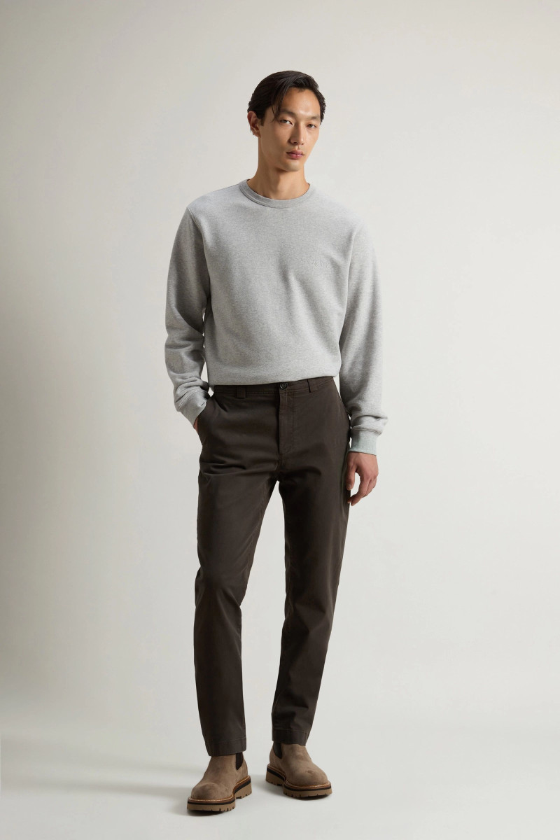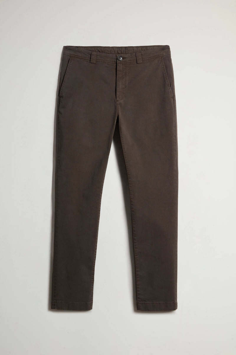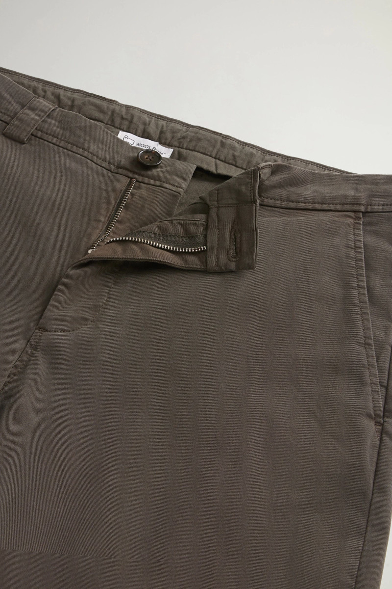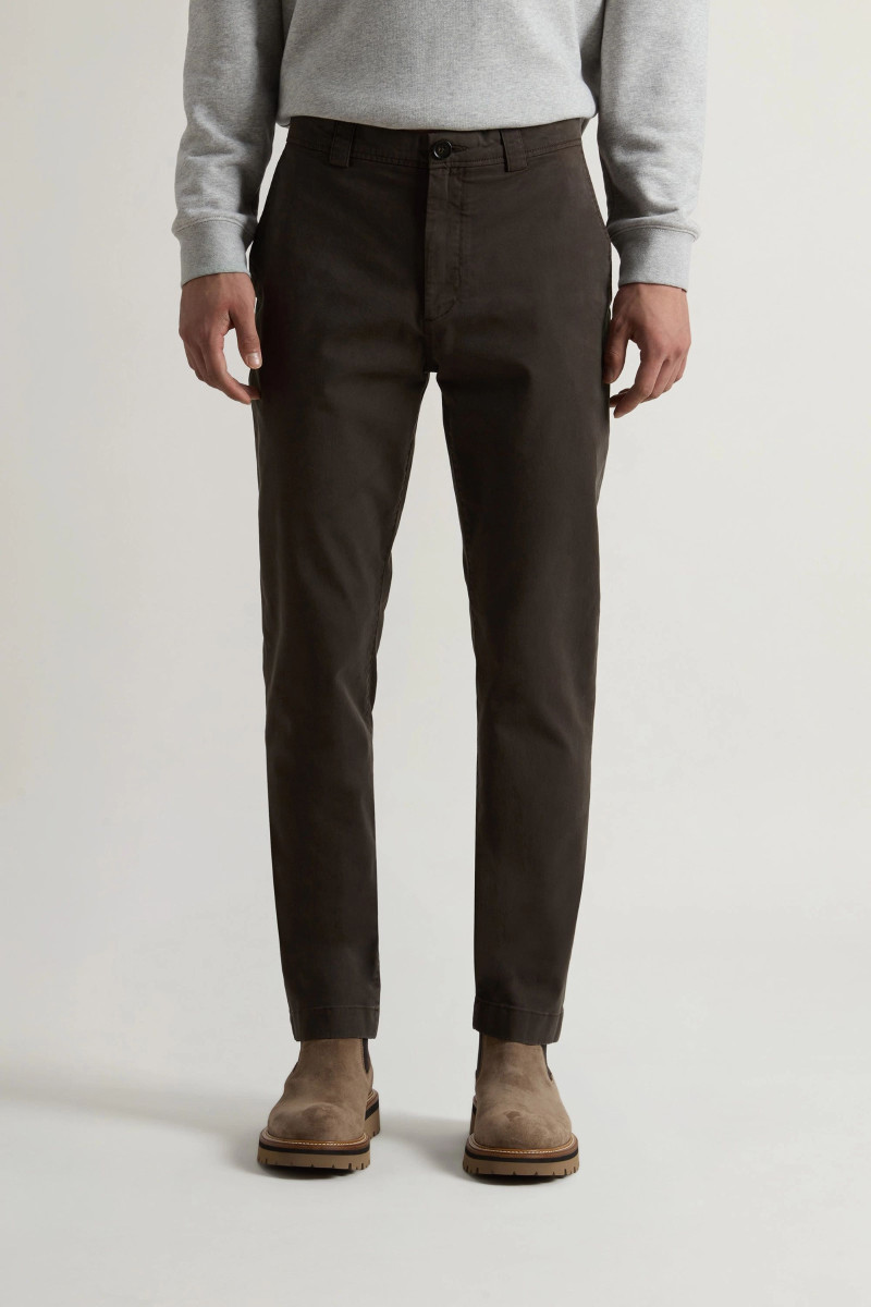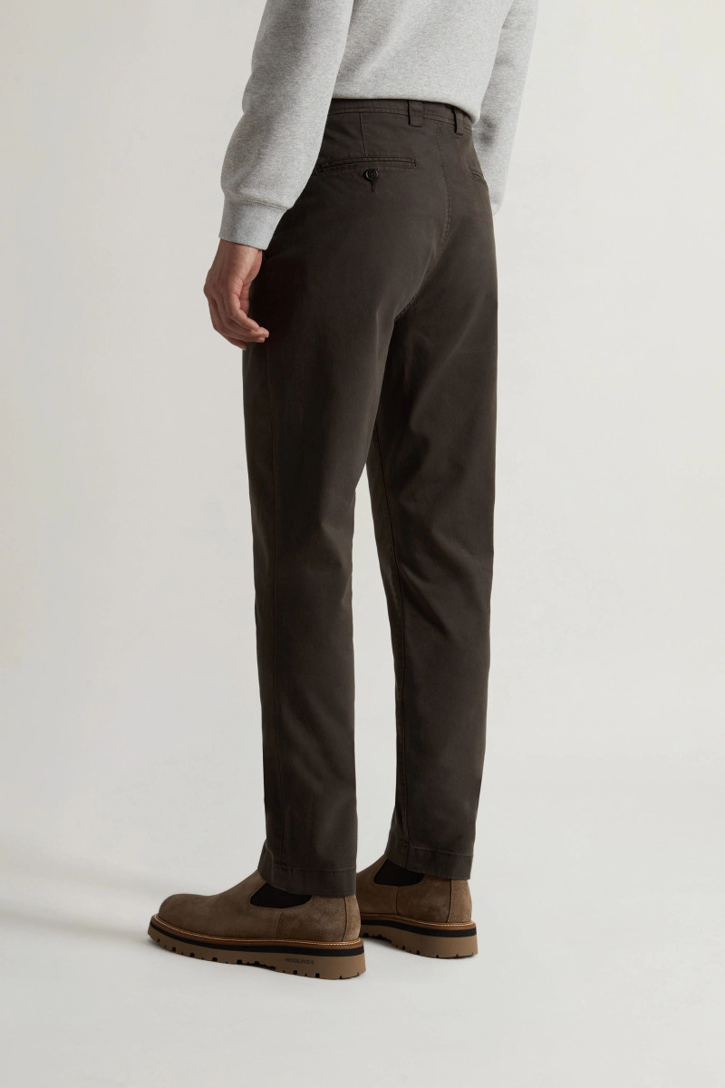 Pánské chino kalhoty slim střihu, které mají středně vysoký pas a zúžené nohavice. Klasický design se zapínáním na knoflík a zip doplňují poutka na opasek, boční klínové kapsy a zadní výpustkové kapsy, z nichž jedna je opatřena knoflíčkem. Mírně broušený vzhled je docílen speciálním barvením již hotového produktu. Zadní díl je ozdoben výšivkou loga Woolrich. Prémiová bavlna spolu s elastanem tvoří velmi komfortní, tvarově stálou a maximálně praktickou kombinaci. Výborně kombinovatelný kousek, který stylově doladí váš sportovně-elegantní outfit.