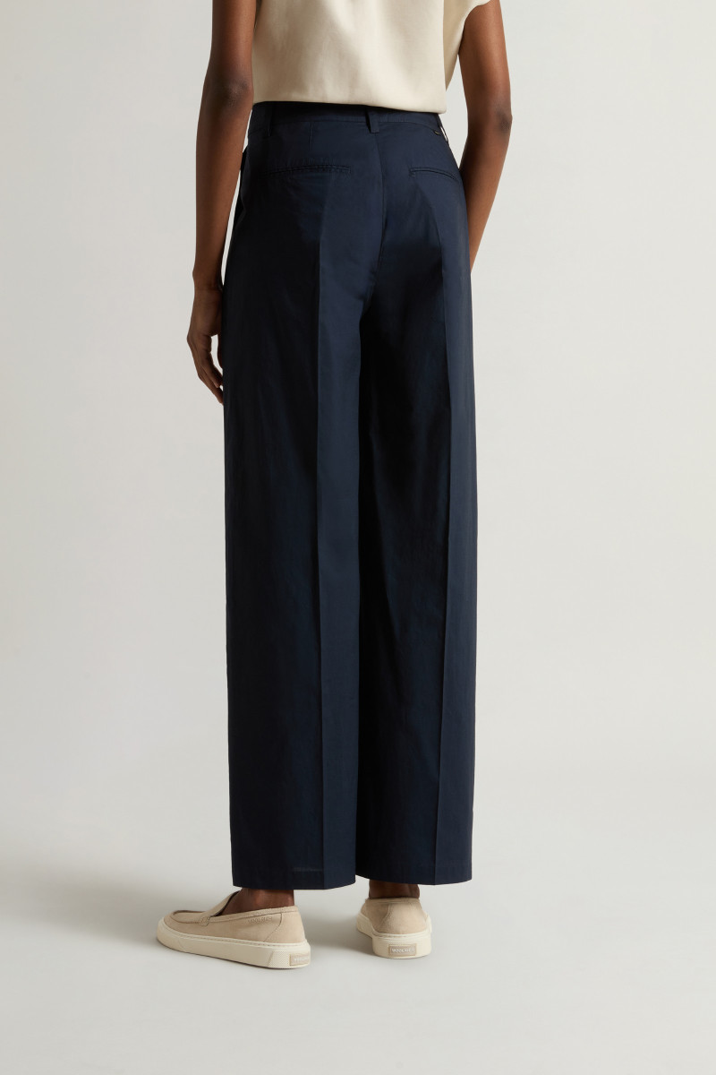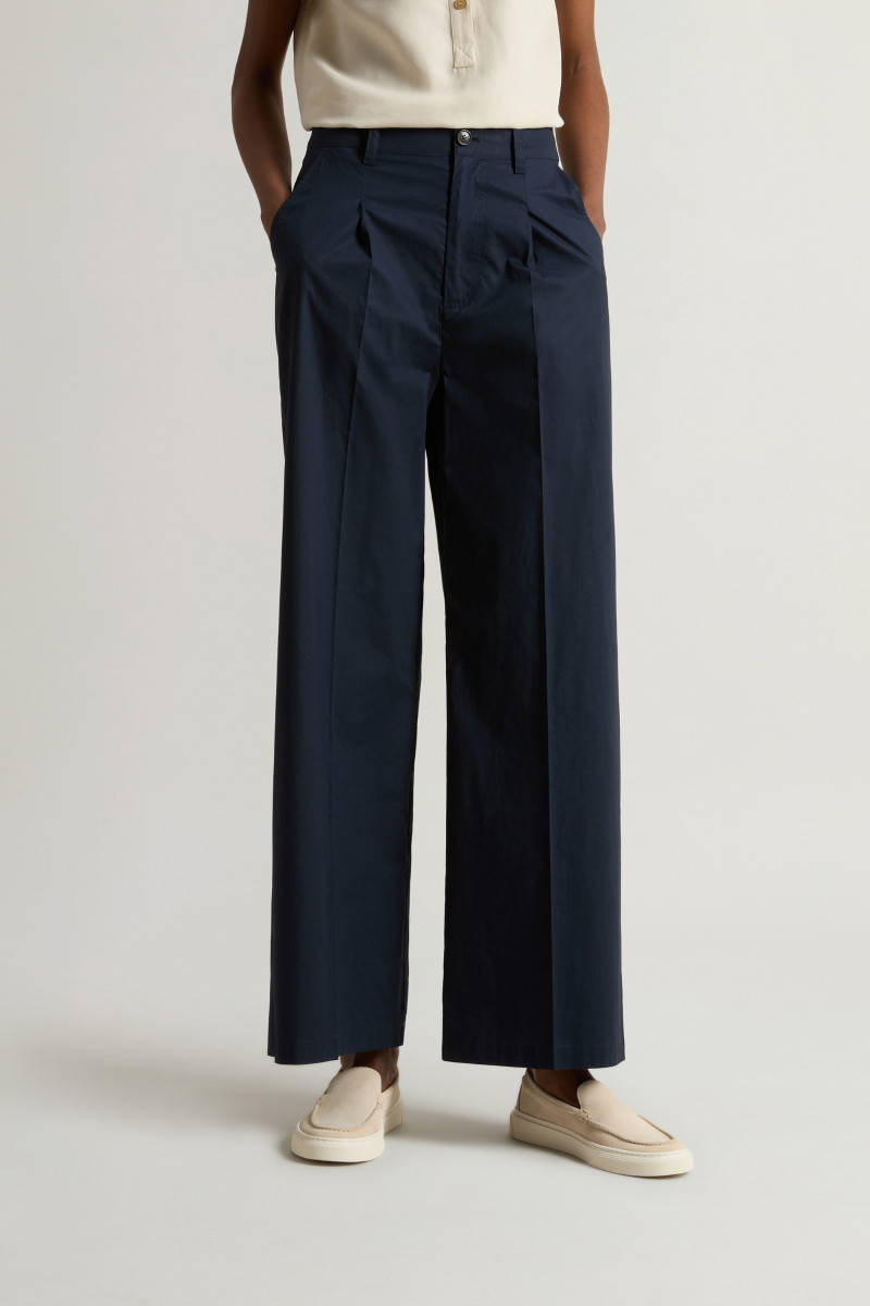 Dámské kalhoty z velmi lehkého bavlněného materiálu. Rovný střih se středně vysokým sedem, poutky na opasek a klasickým kalhotovým zapínáním na knoflík a zip doplňují boční klínové a zadní výpustkové kapsy. Kalhoty jsou na předním díle opatřeny sámky pro větší volnost nohavic. Nechybí decentní label s logem Woolrich umístěný na zadní straně. Jemná popelínová tkanina z prémiové bavlny zaručuje dokonalou prodyšnost, lehkost a příjemný pocit při nošení. Výborně kombinovatelný kousek, který stylově doladí váš sportovně-elegantní outfit.