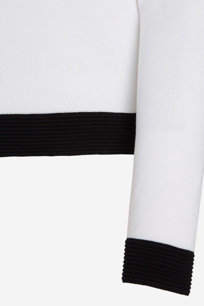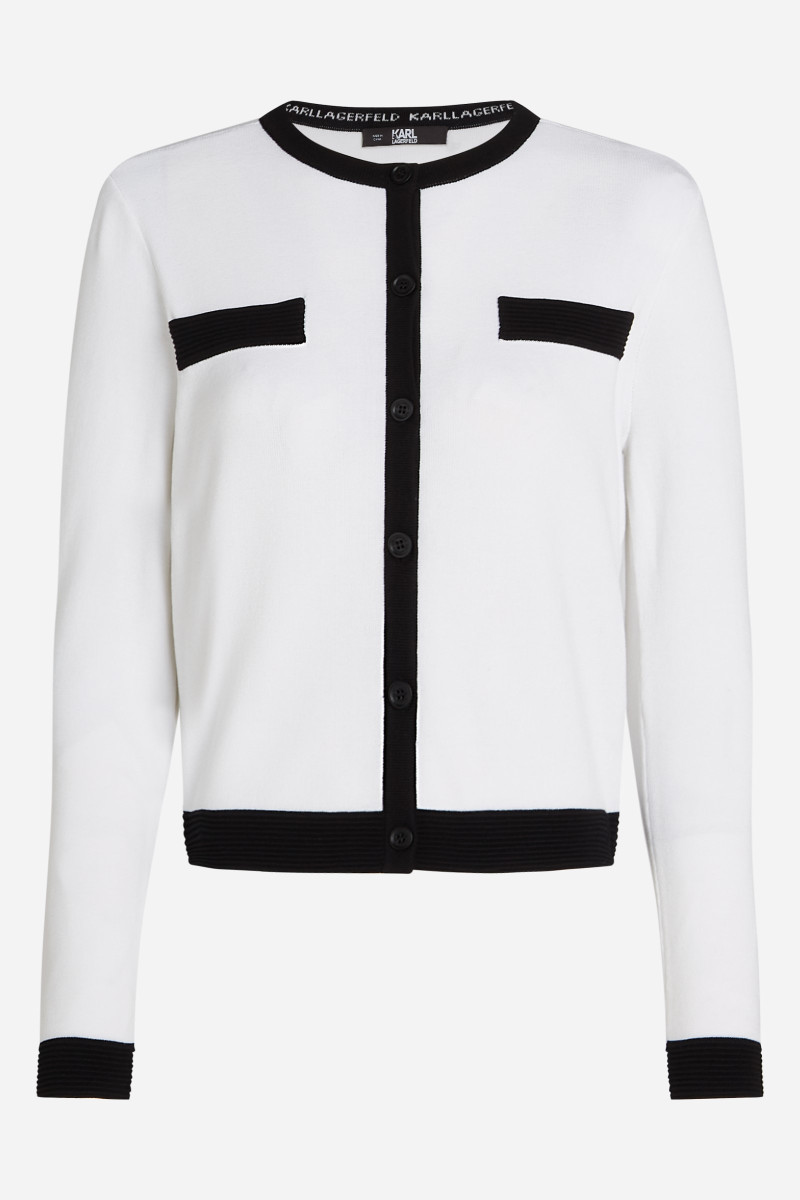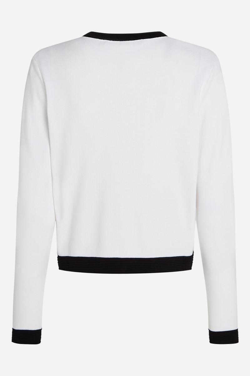 Dámský svetr s dlouhými rukávy a zapínáním na knoflíky. Tento kousek, který je definicí nadčasové elegance, má kontrastní žebrované manžety na rukávech a nádherné ozdobné detaily na límci, náprsních kapsách, knoflíkové léze a spodním lemu a nabízí sofistikovaný vrstvený vzhled. Složení materiálu zaručuje dokonalou splývavost, lehkost a maximální pohodlí během nošení. Velmi rafinovaný a zároveň decentní kousek, který stylově doplní váš outfit.
