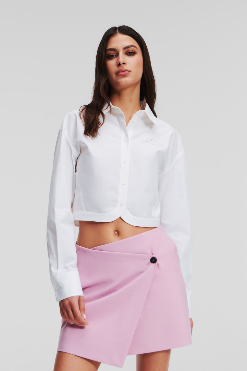 Tato dámská košile, která dokonale kombinuje pařížskou eleganci Karla Lagerfelda s moderní úpravou zkrácené siluety, je nezbytným doplňkem moderního kosmopolitního šatníku. Jemné zakřivení spodního lemu umocňuje její hravý a zároveň klasickou přitažlivost. Nádech půvabu přináší logo Karl Signature s kamínky, které je decentně umístěno tak, aby upoutalo pozornost, zatímco kryté knoflíky zajišťují bezproblémové zapínání vpředu a nabízejí bezchybný, na míru šitý vzhled. Skvělý kombinovatelný kousek v moderním střihu, který stylově doplní váš sportovně-elegantní outfit.