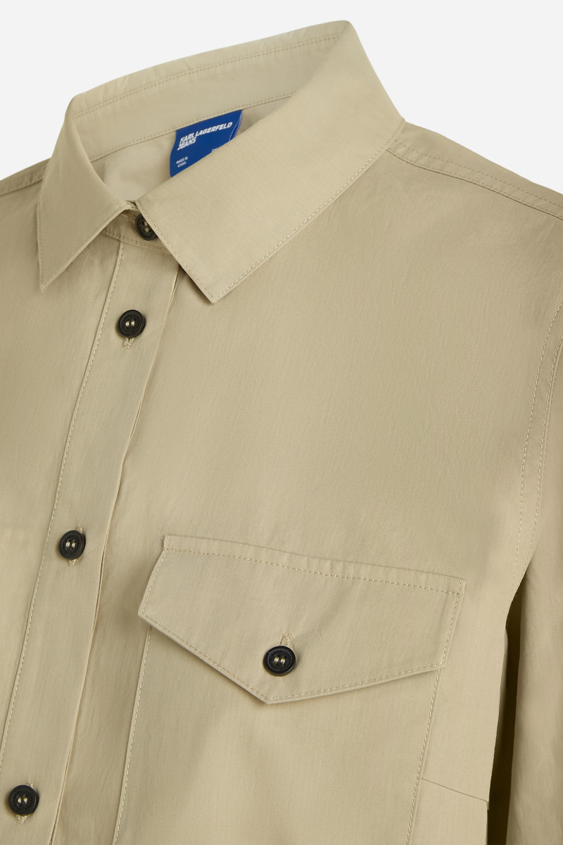 Dámské tričko se zkrácenou délkou zdobené výrazným vyšitým logem Karl Lagerfeld Jeans. Zapínání na knoflíky, náprsní kapsy s knoflíky a manžety na rukávech. Tato minimalistická košile se skvěle hodí k džínám s vysokým pasem nebo jako vrstva pod šaty.