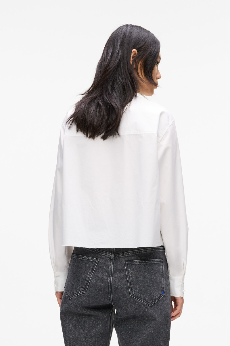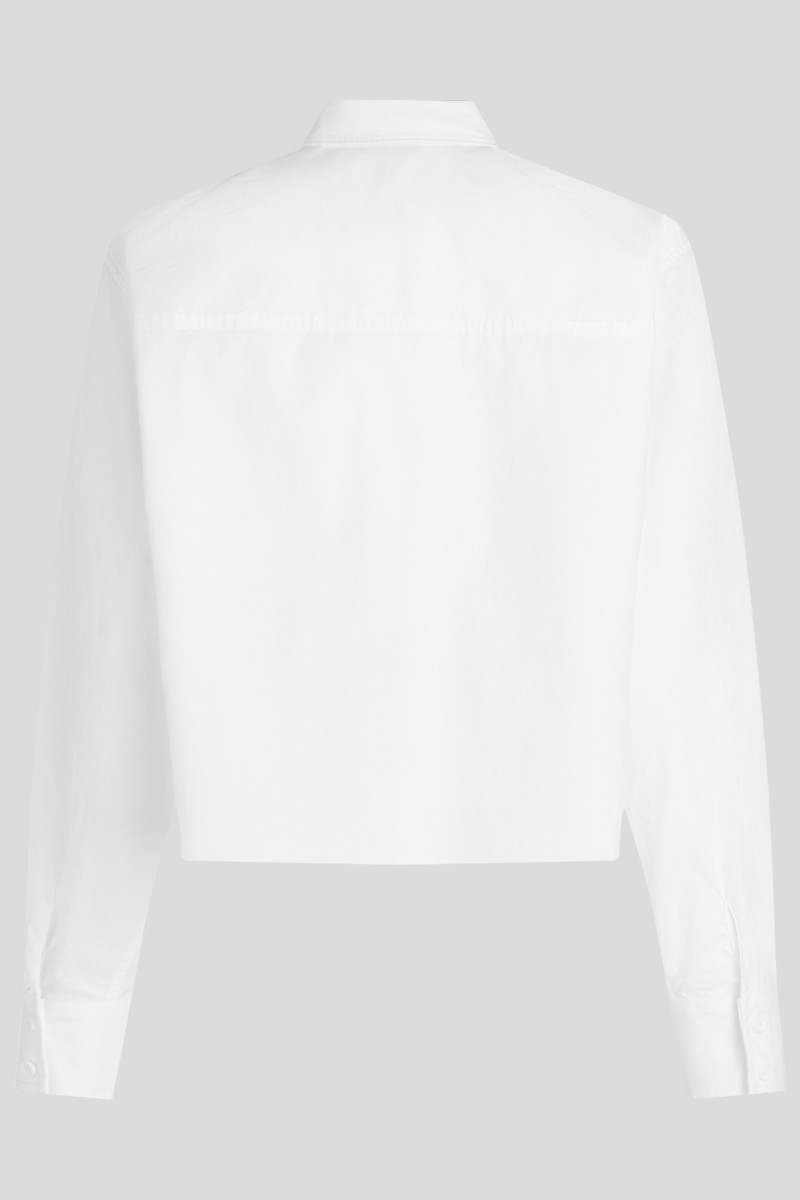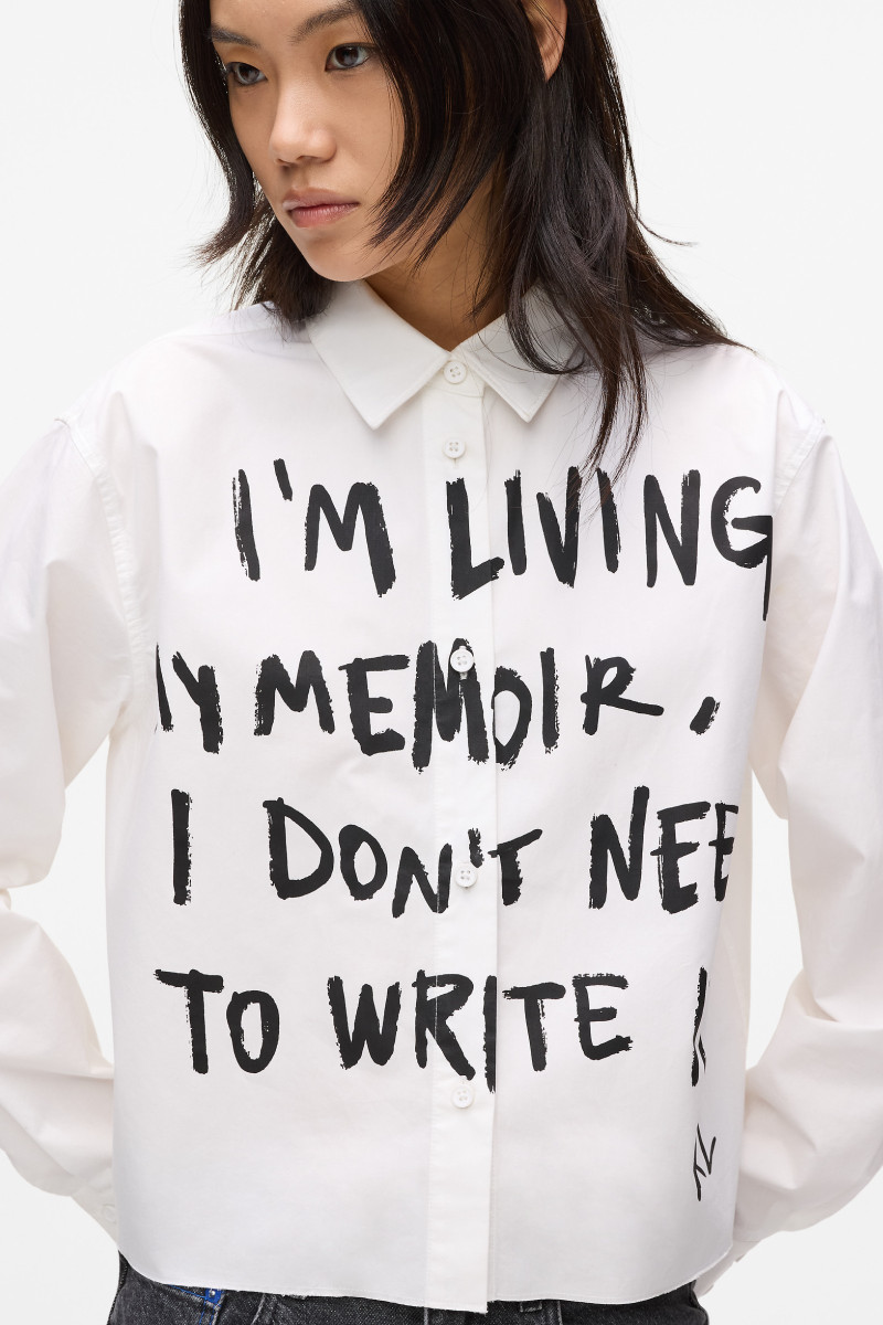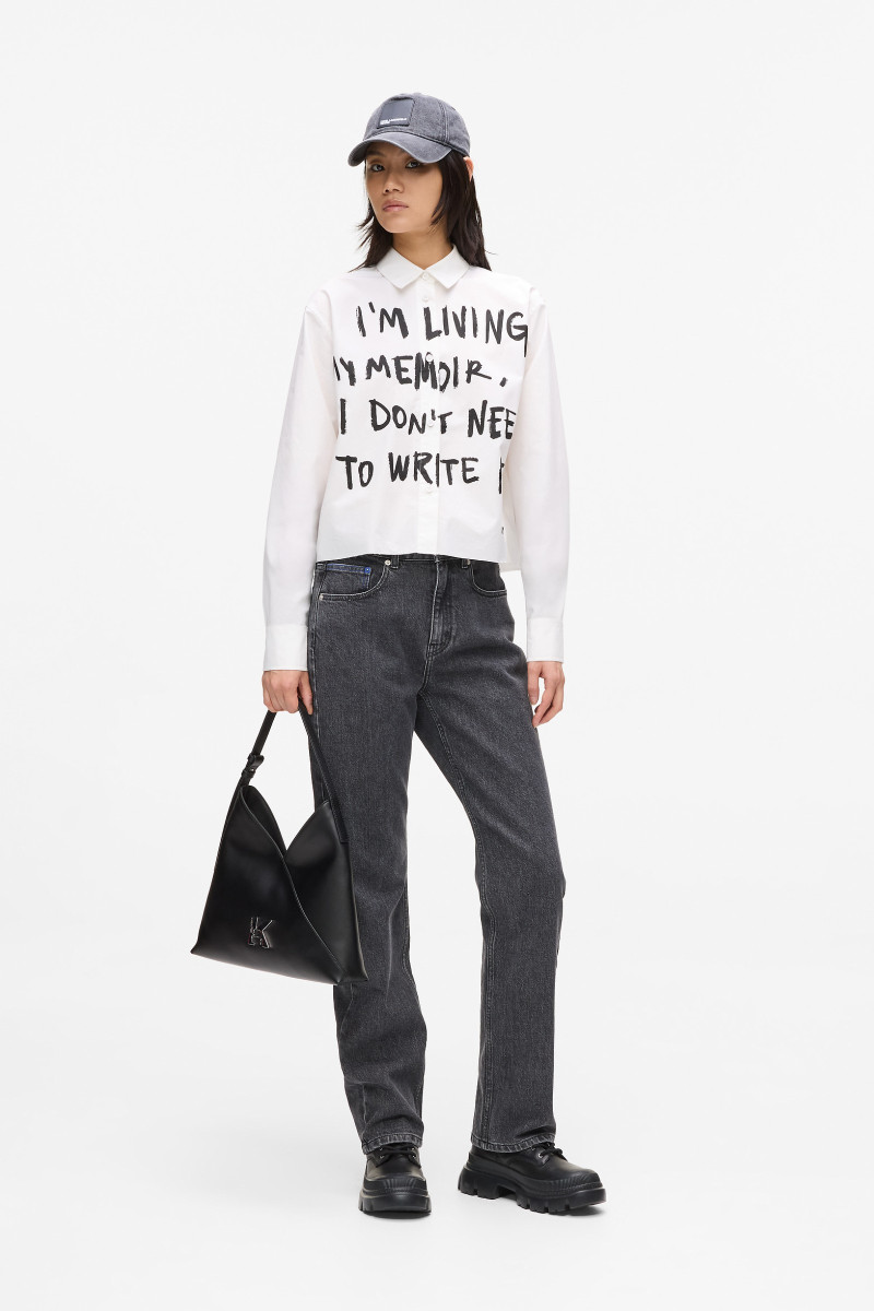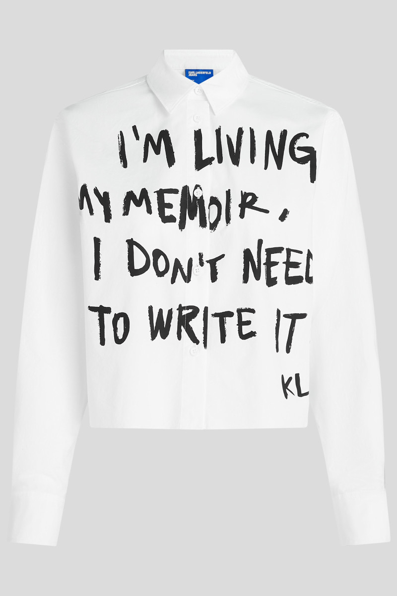 Dámská košile mírně zkráceného střihu. Volný design s dlouhým rukávem a rovně zakončeným lemem v pase doplňuje klasický límec a zapínání na značkové knoflíky. Tento klasický kousek je zdobený výrazným citátem legendárního Karla Lagerfelda na přední straně. Materiálové složení zaručuje dokonalou lehkost, prodyšnost a splývavý vzhled. Skvěle kombinovatelný kousek v moderním střihu, který stylově doladí váš sportovně-elegantní outfit.