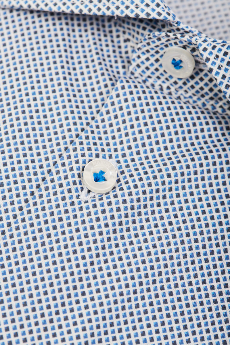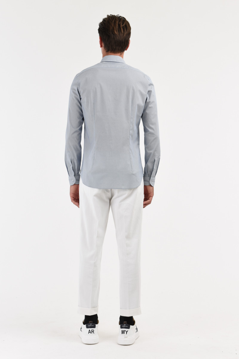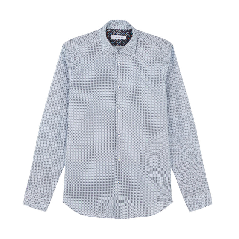 Košile, střih slim fit. Poloviční francouzský límec s vyjímatelnou výztuží. Na zádech dva sámky, přední zapínání a manžety na knoflíky, zaoblený lem.