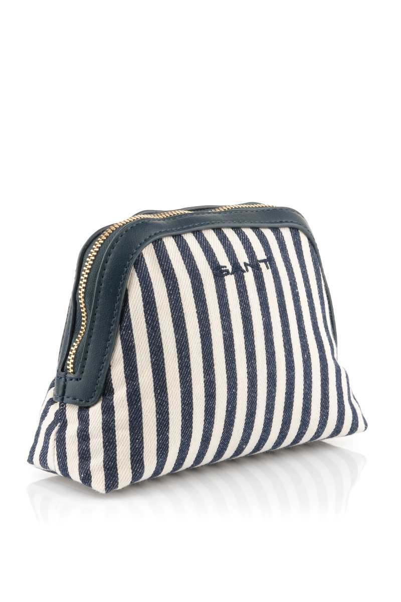 Dámské toaletní pouzdro z bavlněného materiálu. Sportovně-elegantní design s pruhovaným vzorem a zapínáním na kovový zip zlaté barvy doplňuje působivý znak monogramu a logo Gant. Podšitý interiér je opatřen plochou kapsičkou. Materiálové složení zaručuje odolnost, lehkost a praktickou údržbu. Velmi vkusný doplněk vašeho cestovního zavazadla či kabelky, díky němuž budete mít svoji kosmetiku vždy při ruce.