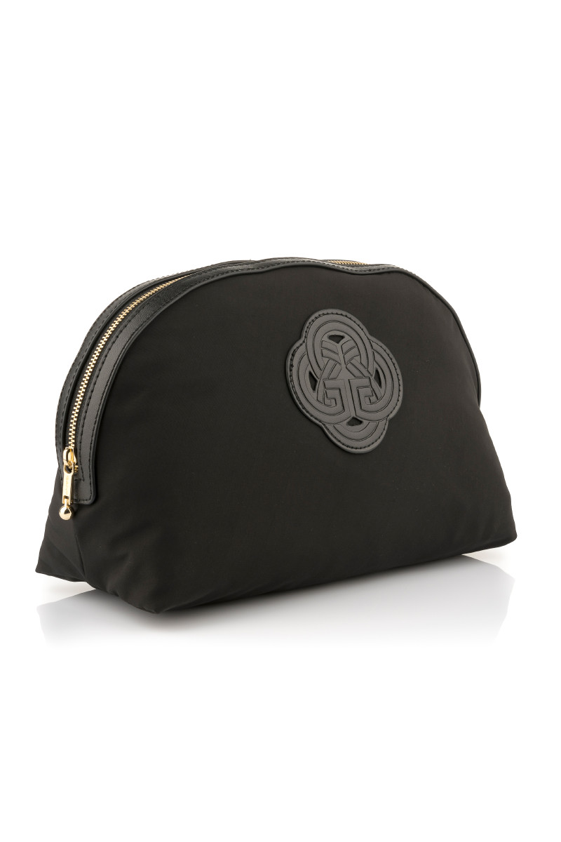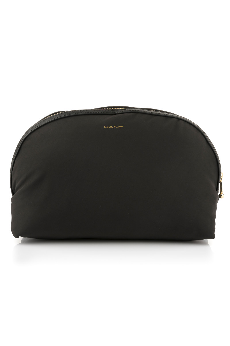 Dámské toaletní pouzdro z recyklovaného syntetického materiálu. Elegantní design s koženými lemy a nášivkou monogramu doplňuje zapínání na kovový zip a zlatý potisk loga Gant umístěný na zadní straně. Interiér je opatřen jemnou podšívkou. Materiálové složení zaručuje odolnost a lehkost. Velmi vkusný doplněk vašeho cestovního zavazadla či kabelky, díky němuž budete mít svoji kosmetiku vždy při ruce.