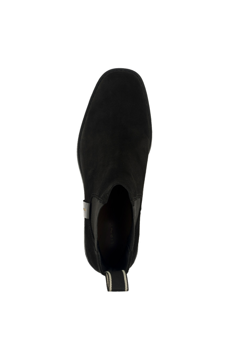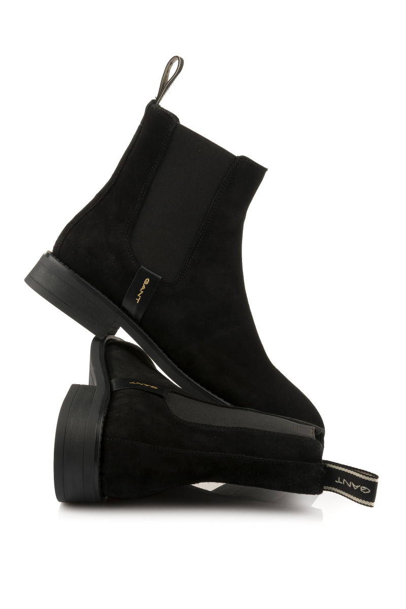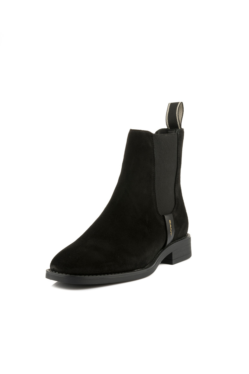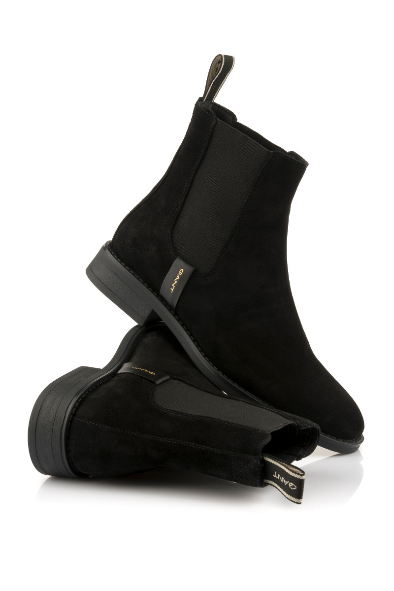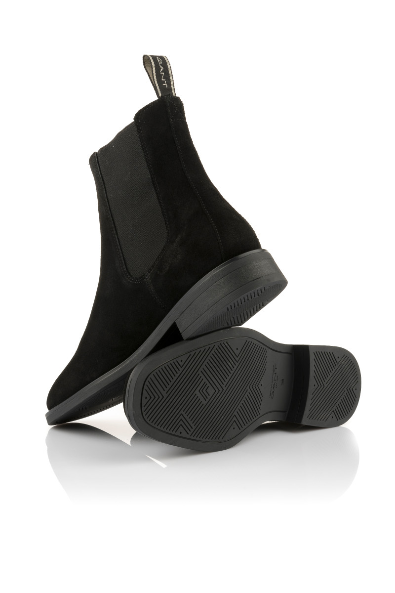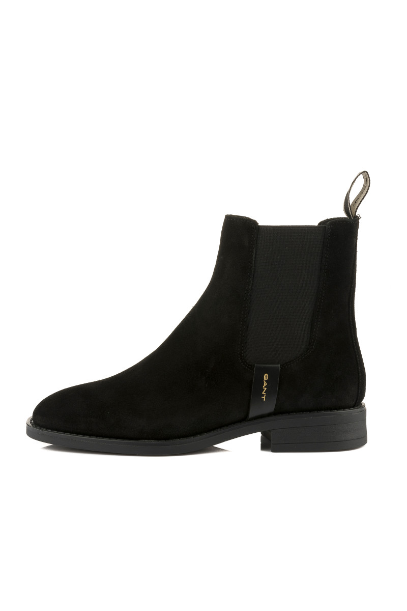 Dámské kotníčkové boty z broušené hovězí usně prémiové kvality, které vás zaujmou svým nadčasovým vzhledem a univerzálním využitím. Sportovně-elegantní design se zakulacenou špičkou a nízkým podpatkem doplňuje kožený detail na vnější straně zdobený decentním logem Gant. Nechybí pružné klínky po stranách a tkané poutko na patě pro pohodlné nazouvání. Textilní interiér je opatřen koženou stélkou. Výborně kombinovatelná obuv, která stylově doladí váš podzimní outfit.