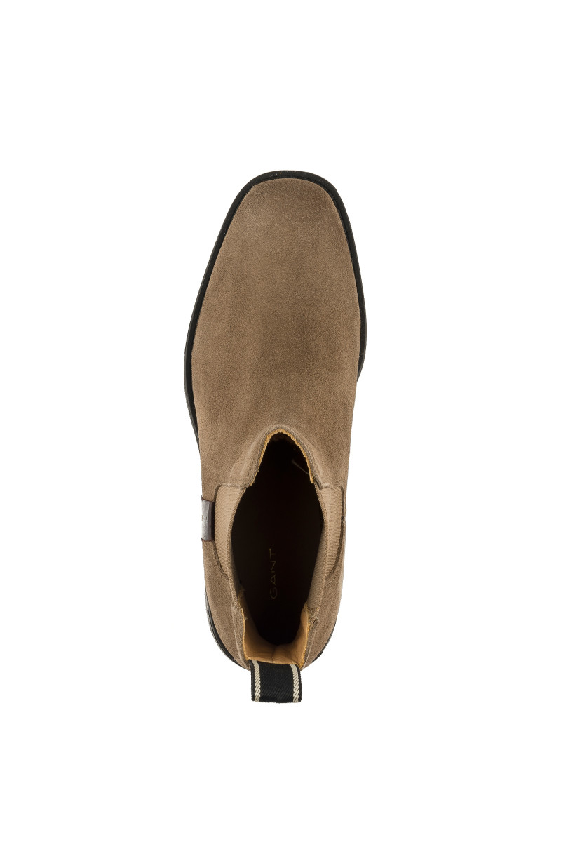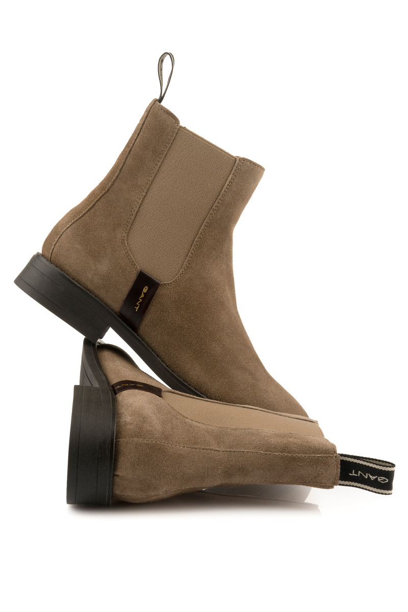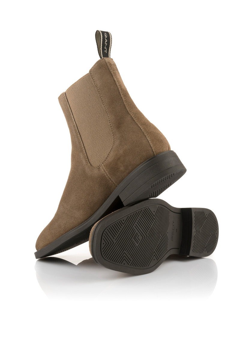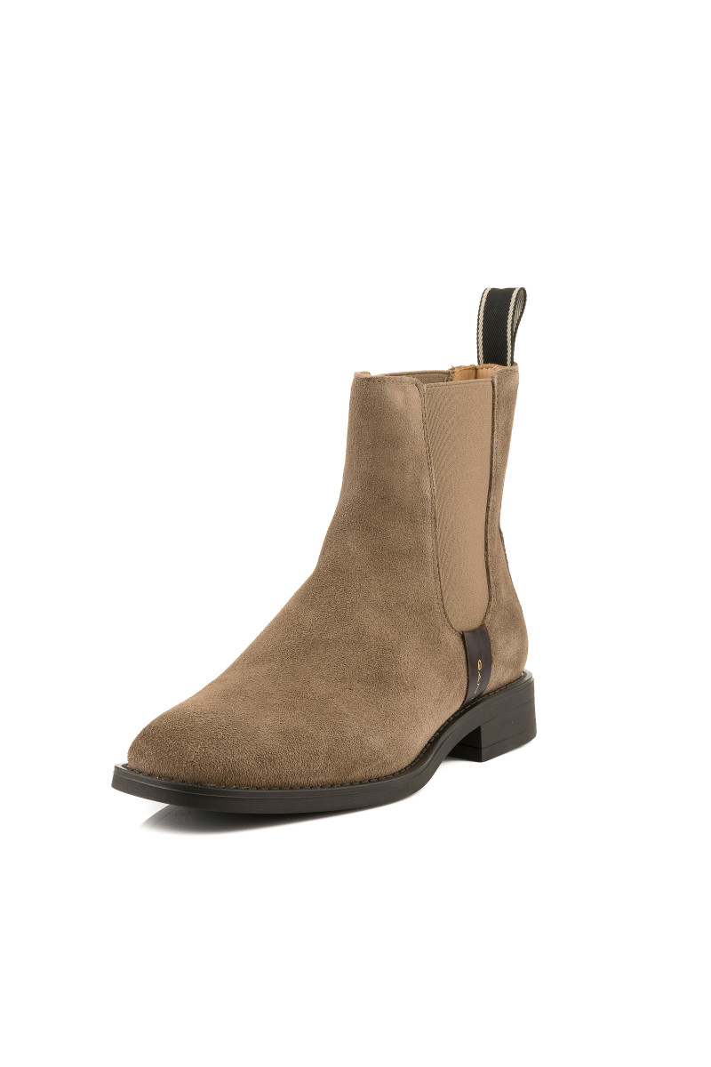 Dámské kotníčkové boty z broušené hovězí usně prémiové kvality, které vás zaujmou svým nadčasovým vzhledem a univerzálním využitím. Sportovně-elegantní design se zakulacenou špičkou a nízkým podpatkem doplňuje kožený detail na vnější straně zdobený decentním logem Gant. Nechybí pružné klínky po stranách a tkané poutko na patě pro pohodlné nazouvání. Textilní interiér je opatřen koženou stélkou. Výborně kombinovatelná obuv, která stylově doladí váš podzimní outfit.