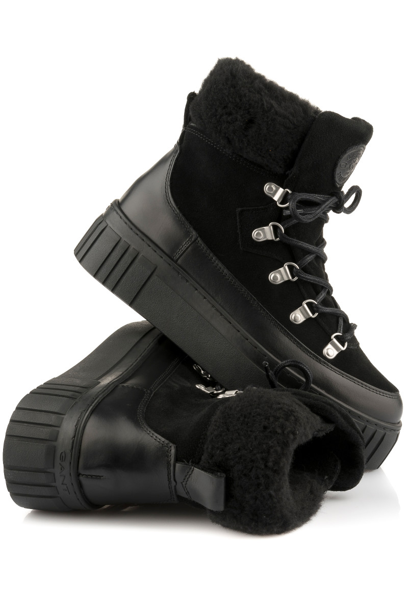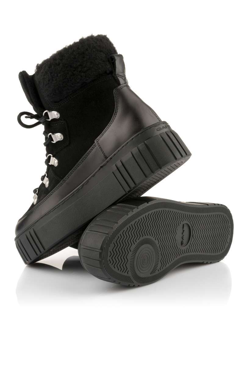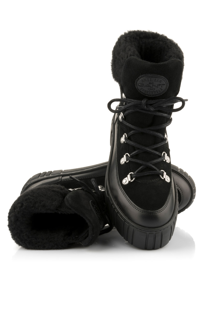 Zimní kotníčkové boty z broušené a hladké hovězí usně prémiové kvality. Sportovní design s kovovými úchyty a pevnými tkaničkami na šněrování doplňuje zvýšená pryžová podrážka se strukturovaným vzorem. Boty jsou ozdobeny vlněným lemem a logem Gant našitým na jazyku. Nechybí poutko na patě pro pohodlnější nazouvání. Hřejivý vlněný interiér zvyšuje tepelnou izolaci. Dokonale stylová a praktická obuv, která vám poskytne maximální komfort i v těch nejchladnějších dnech.