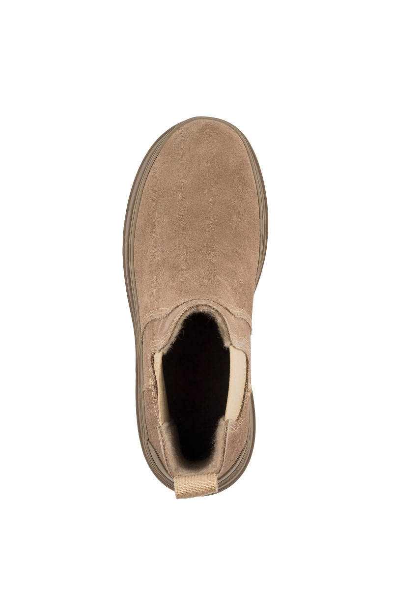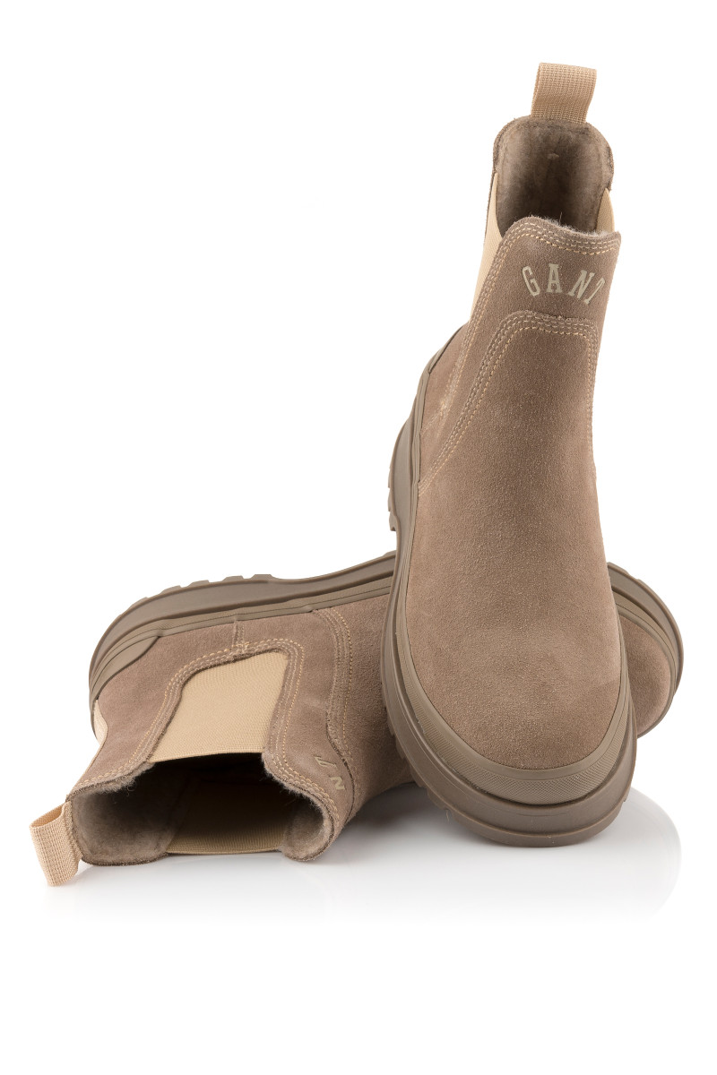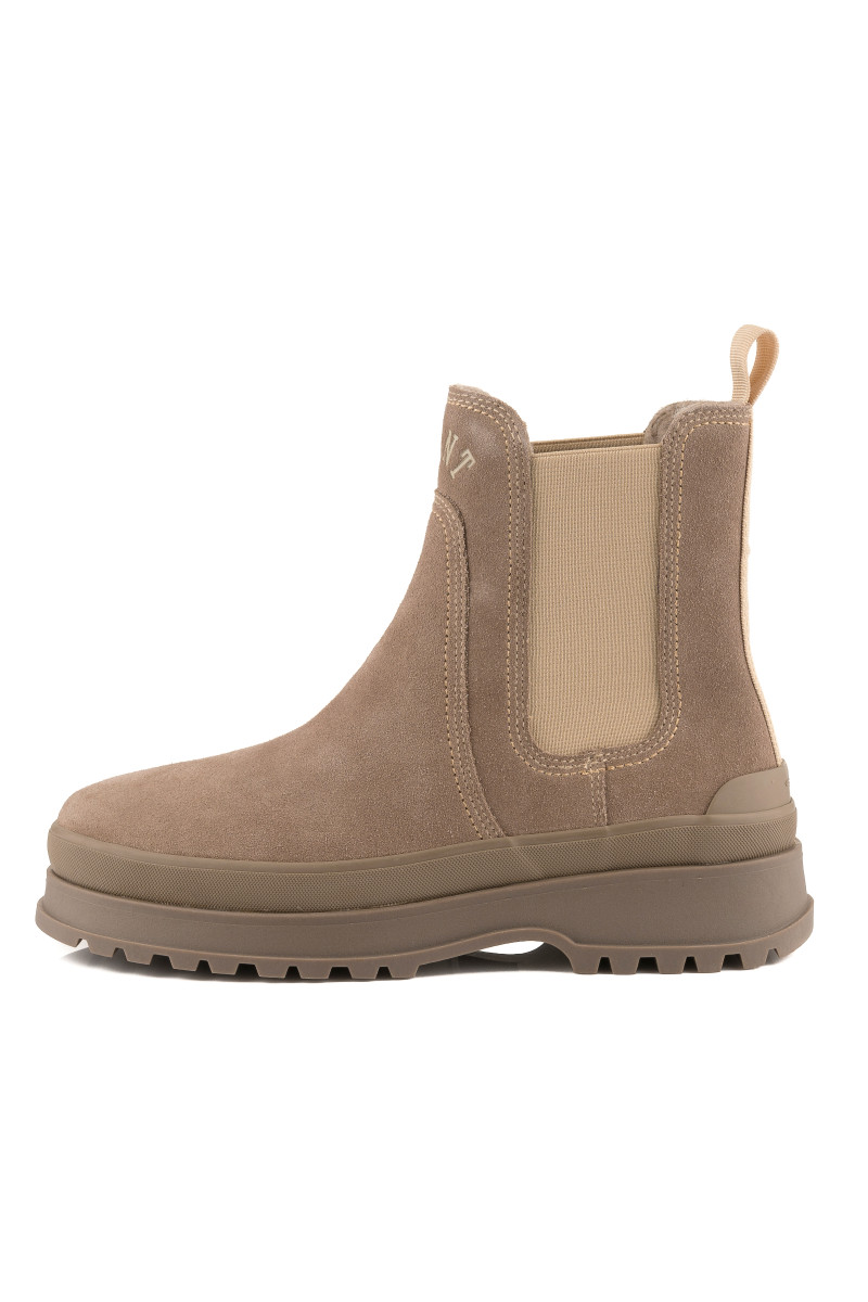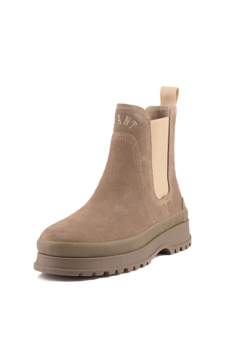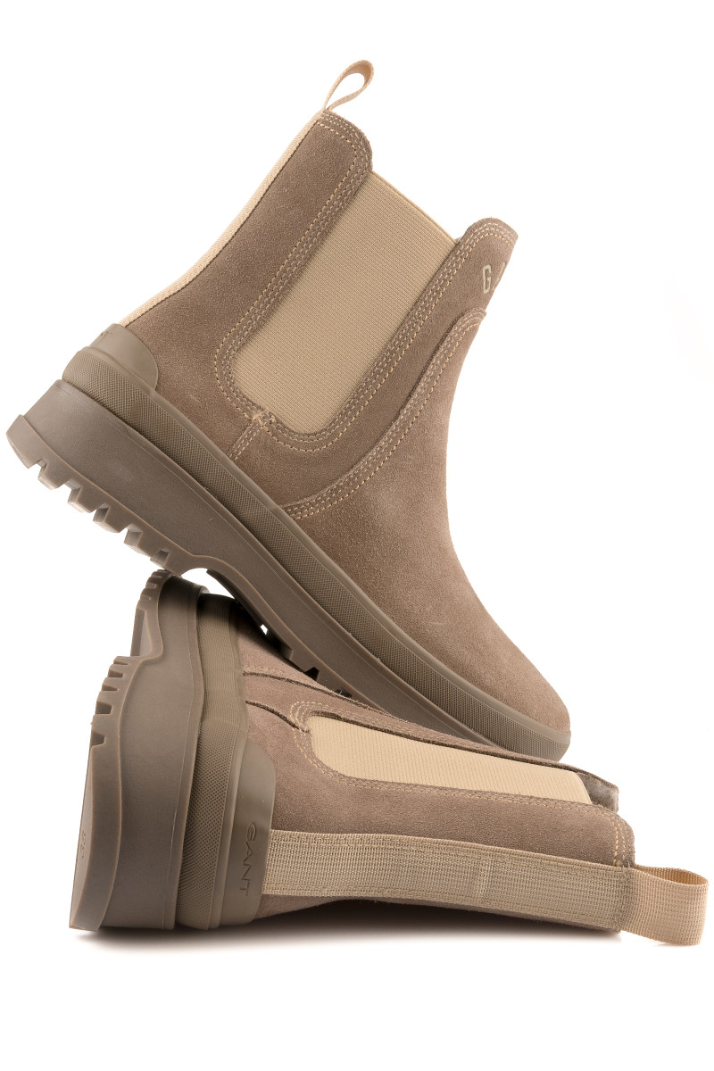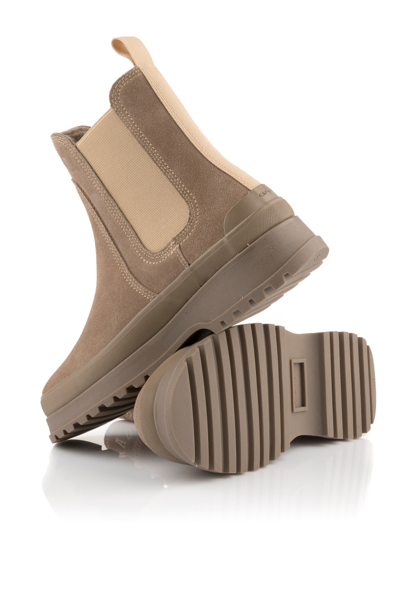 Zimní kotníčkové boty z broušené hovězí usně prémiové kvality. Sportovně-elegantní design s decentním logem Gant umístěným na přední straně doplňuje pryžová podrážka se strukturovaným vzorem a zvýšeným pogumovaným lemem pro větší funkčnost. Nechybí pružné klínky po stranách a tkané poutko na patě pro pohodlnější nazouvání. Hřejivý vlněný interiér je opatřen koženou stélkou. Dokonale stylová a praktická obuv, která vám poskytne maximální komfort v chladných dnech.