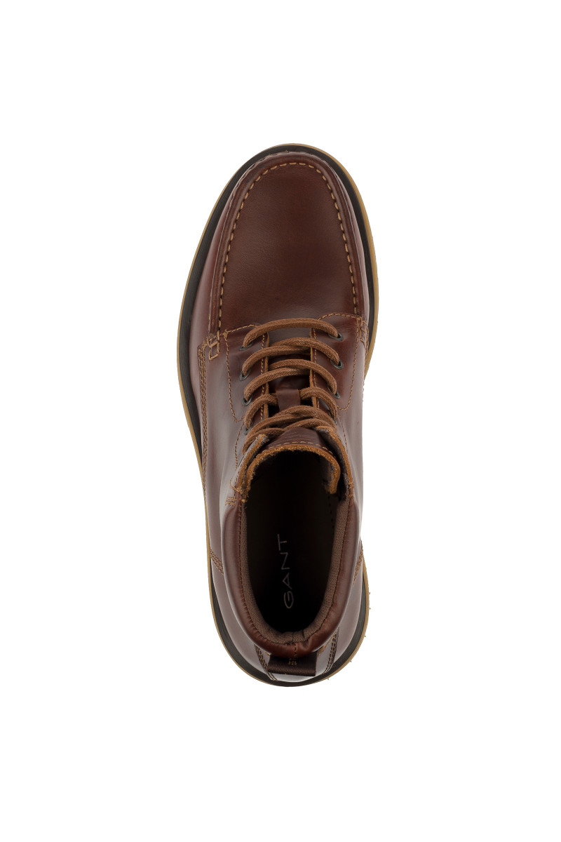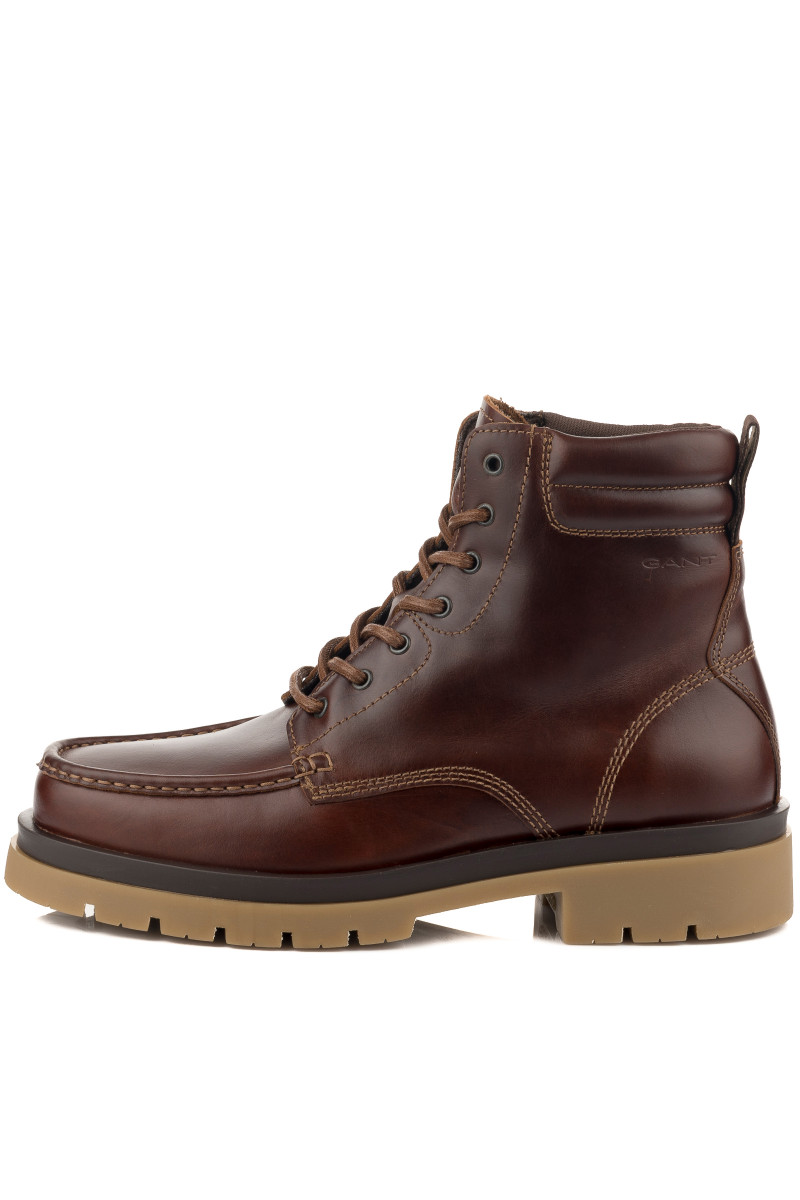 Pánská kotníčková obuv s rustikálním prošíváním na špičce, jenž dokonale koresponduje s vyšší, výrazně vzorovanou podešví z pryže. Svrchní materiál tvoří hladká hovězí useň prémiové kvality, která je mimořádná odolná a trvanlivá, avšak příjemně měkká. Minimalistický branding vytlačený na boční straně, efektní detail poutka na patě. Prodyšné textilní podšití, dokonale poddajná kožená stélka, která maximalizuje komfortní pocit při chůzi. Trendy doplněk ležérních outfitů, který vybízí ke kreativnímu stylingu.
