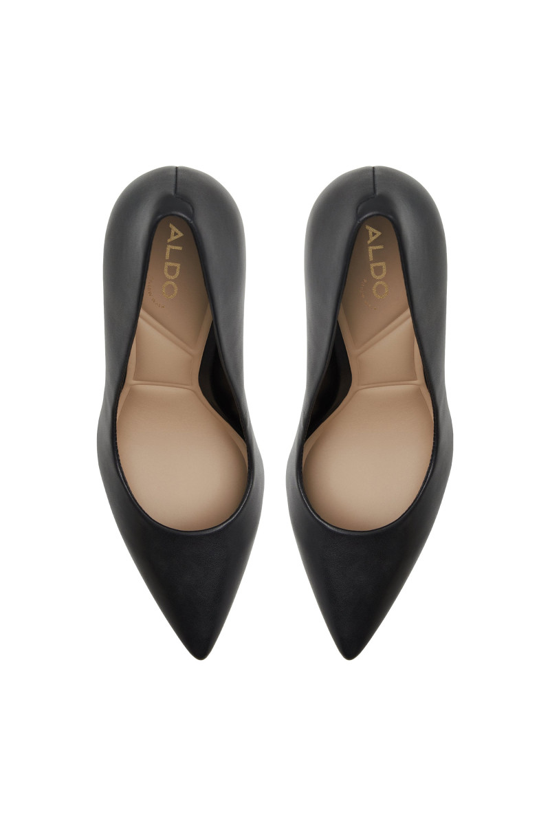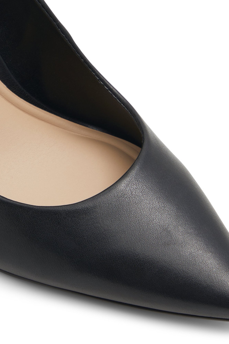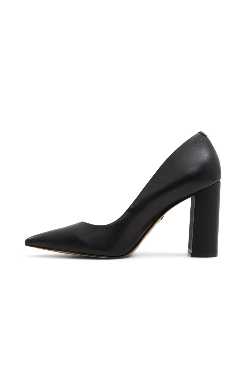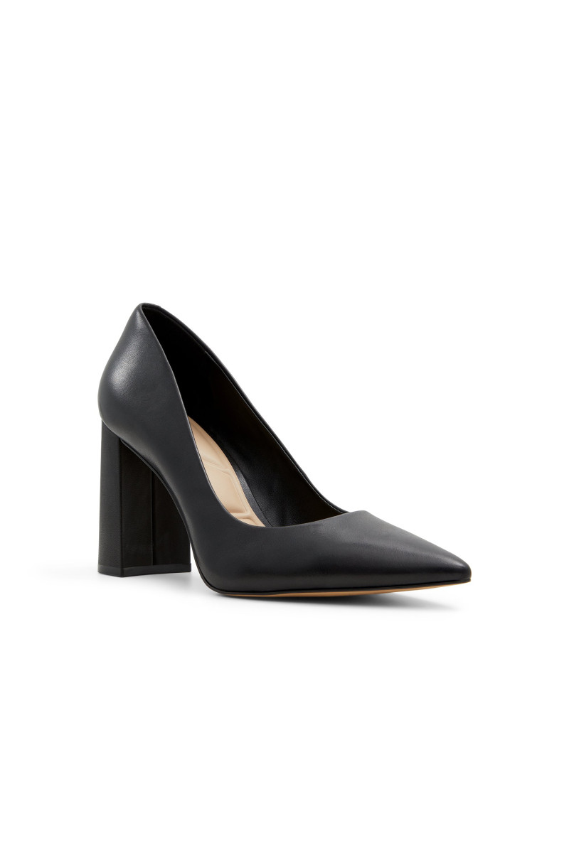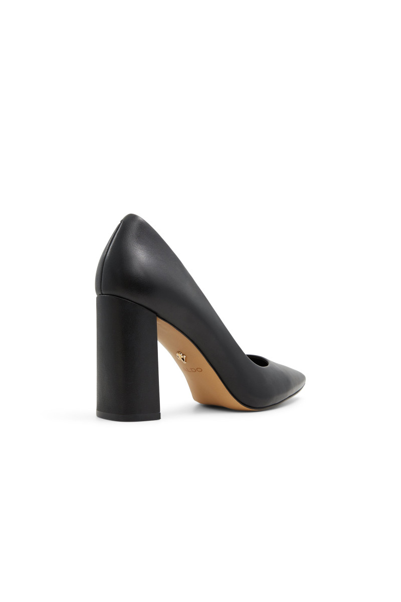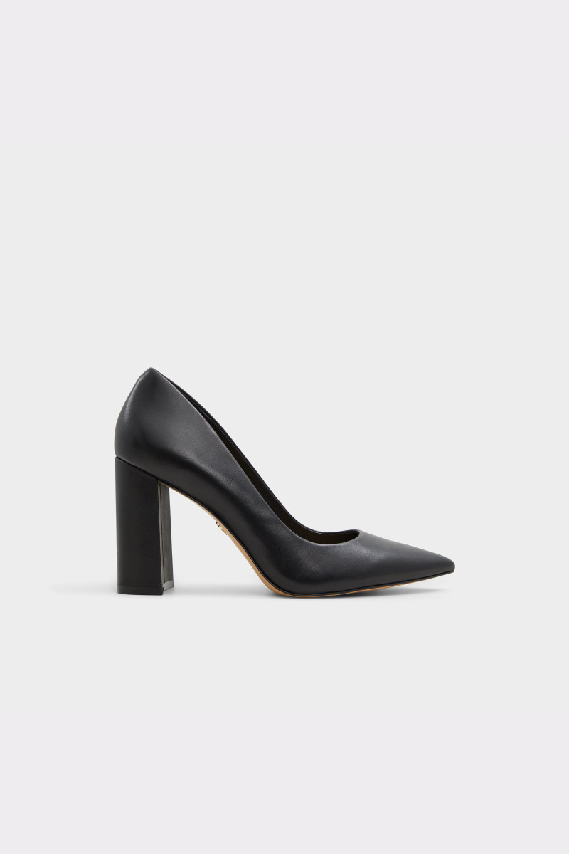 Jemná černá kůže tvaruje lodičky s špičatou špičkou a vysokým blokovým podpatkem, které nabízí výšku mrakodrapu a stabilitu městského chodníku pro dlouhé dny a noci. Kombinujte s upravenými kalhotami pro ranní prezentace nebo vyměňte za šaty na závazky, když večeře při svíčkách přejdou do playlistů na střeše.