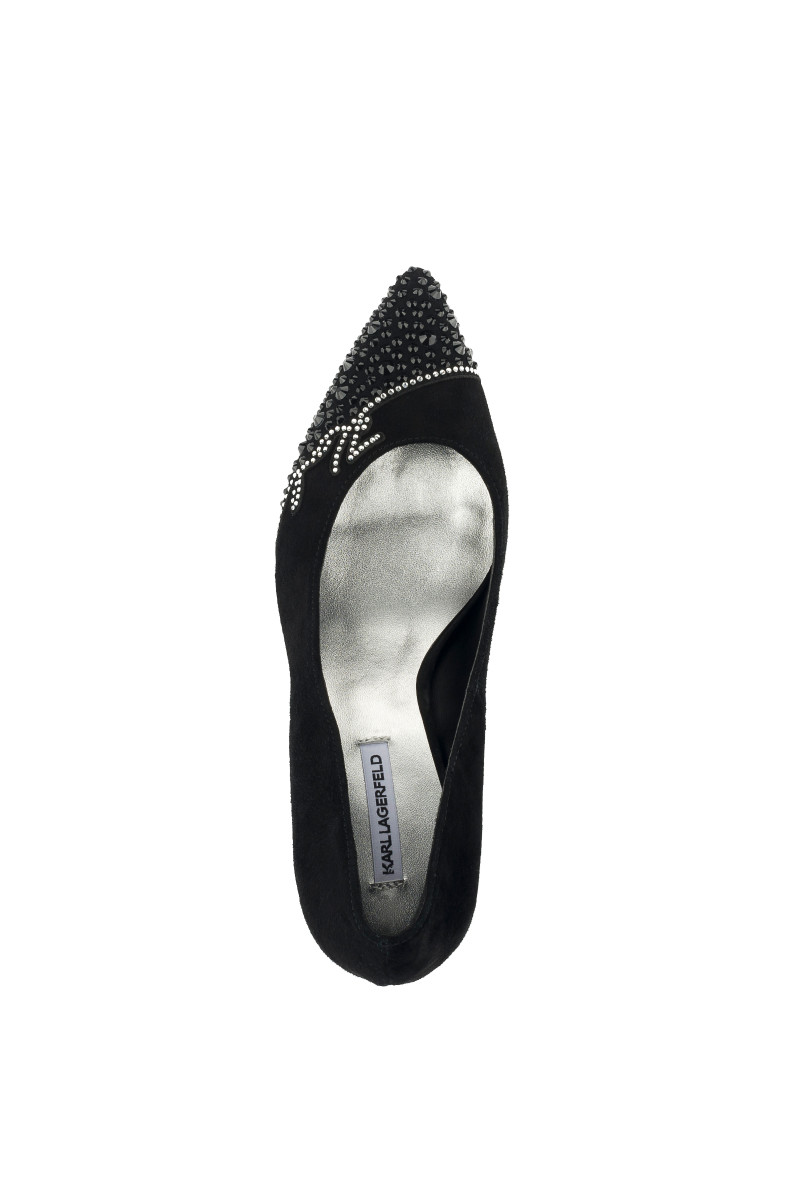 Dámské lodičky z broušené usně, které vás zaujmou svým exkluzivním vzhledem a originálními detaily. Elegantní design s ostrou špičkou a středně vysokým podpatkem doplňují efektní kamínky na špičce olemované třpytivým logem KARL Signature. Nezaměnitelně stylová obuv, která bude ozdobou vašeho večerního outfitu.