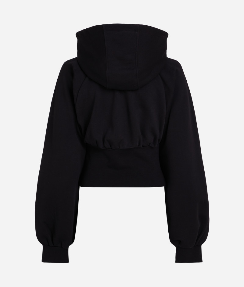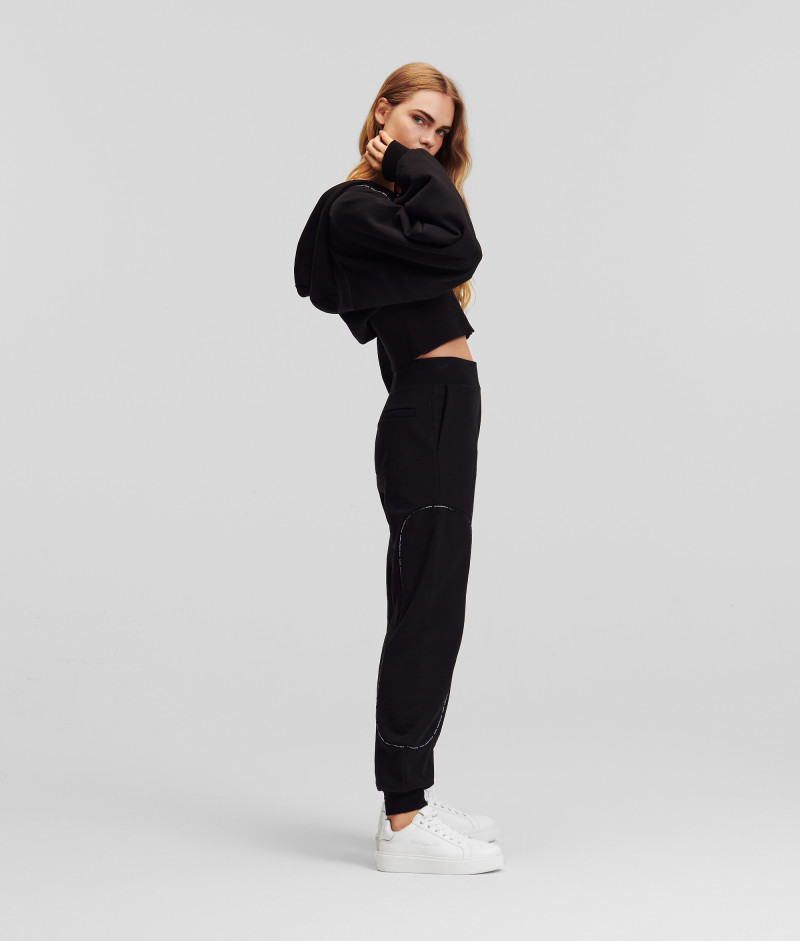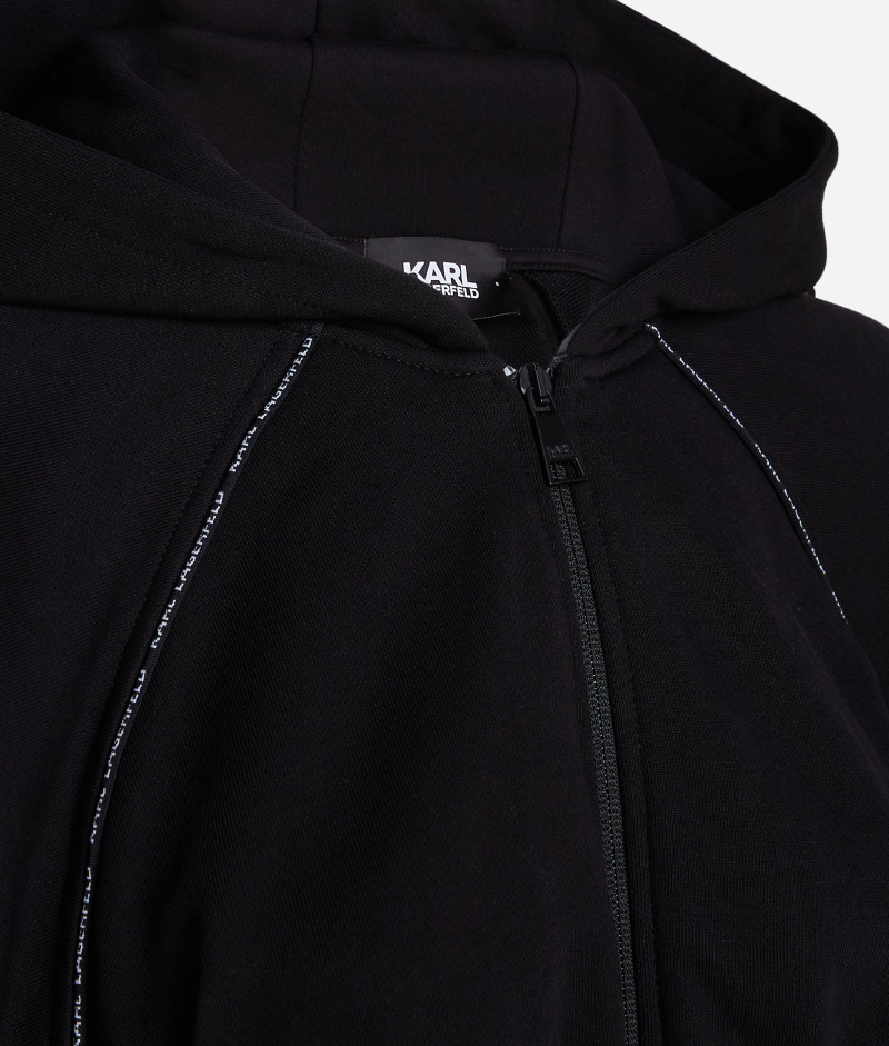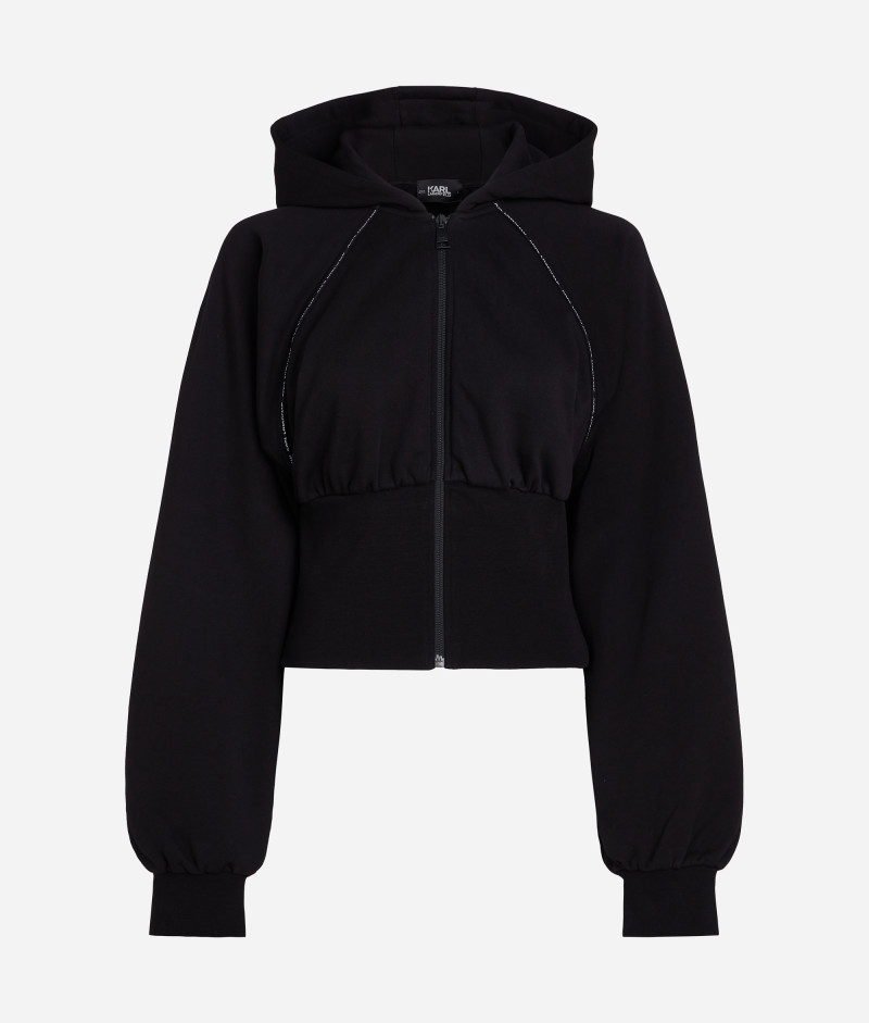 Dámská zkrácená mikina s kapucí, kterou zdobí kontrastní prošití s detailem loga KARL LAGERFELD umístěné na předním díle. Jednobarevný design se zapínáním na zip doplňuje vysoký žebrovaný lem v pase a na raglánových rukávech. 100% organická bavlna je zárukou maximální prodyšnosti, pohodlí a snadné údržby. Nezaměnitelně stylový kousek pro sport a volný čas.