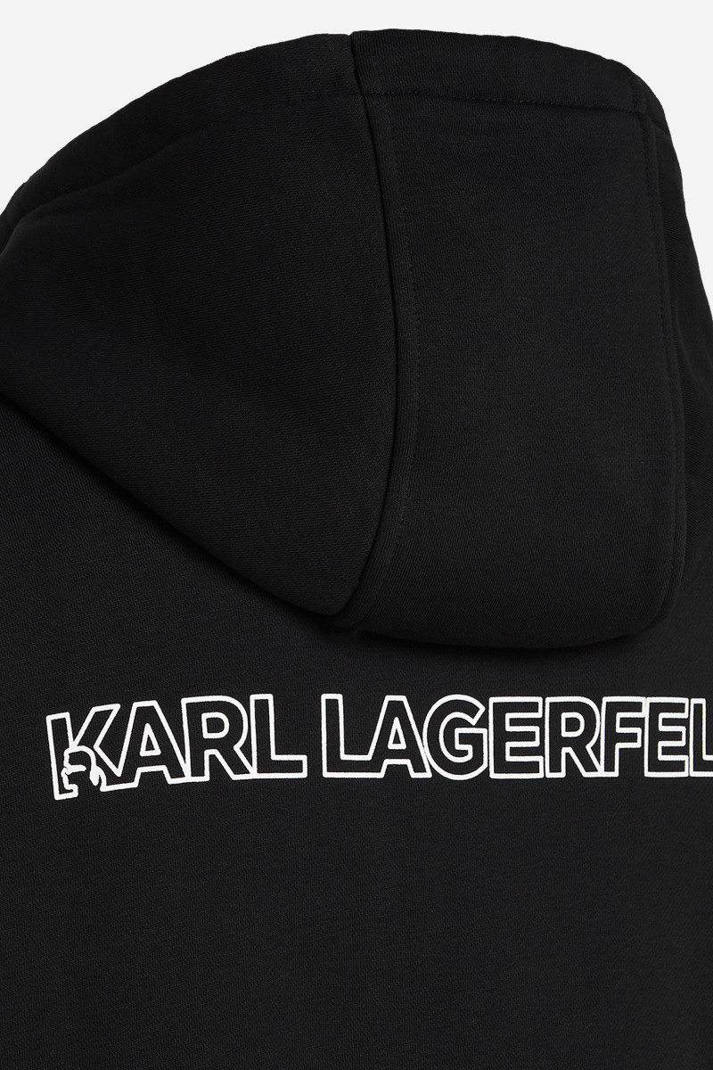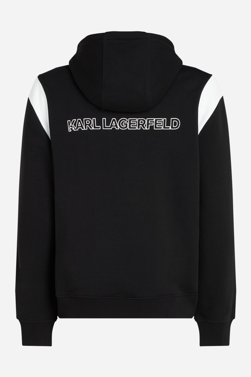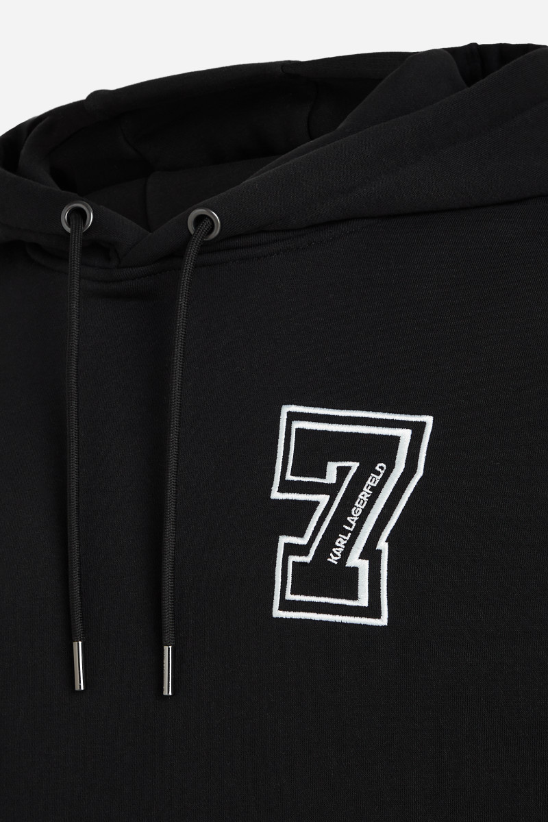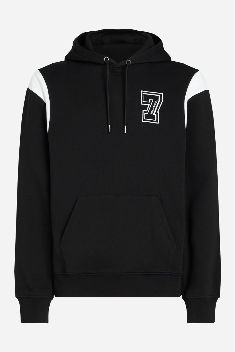 Pánská mikina s kapucí. Praktický rovný střih s elastickým pasem a manžetami rukávů. Mikinu zdobí vyšité šťastné číslo 7 Karla Lagerfelda, výrazné logo na zádech a kontrastní ramenní vsadky. Materiálové složení tvoří příjemně měkký úplet z bavlněného vlákna prvotřídní kvality, který je hřejivý, ale dokonale prodyšný. Pružnost a poddajnost představují pohodlný a dokonale padnoucí kousek. Stylový volnočasový kousek, který se stane oblíbenou součástí vašich outfitů.