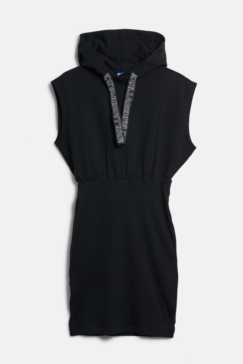 Dámské mikinové šaty bez rukávů s kapucí. Přiléhavý střih s délkou nad kolena, výrazné šnůrky na kapuci, doplněné originálním štítkem s logem Karl Lagerfeld Jeans umístěným na zadním lemu. Měkký bavlněný úplet s příměsí elastanu zajišťuje maximální pohodlí během nošení i udržitelnost. Dokonale pohodlný a praktický kousek, který stylově doplní váš ležérní outfit.