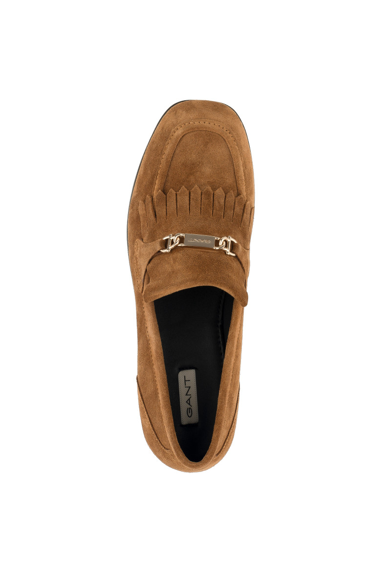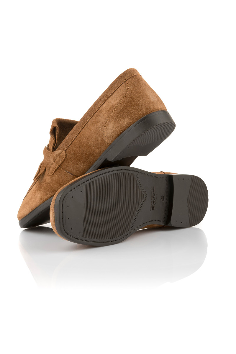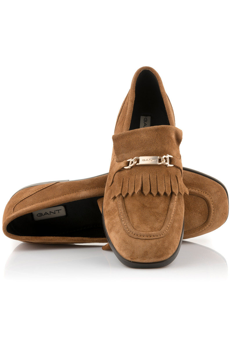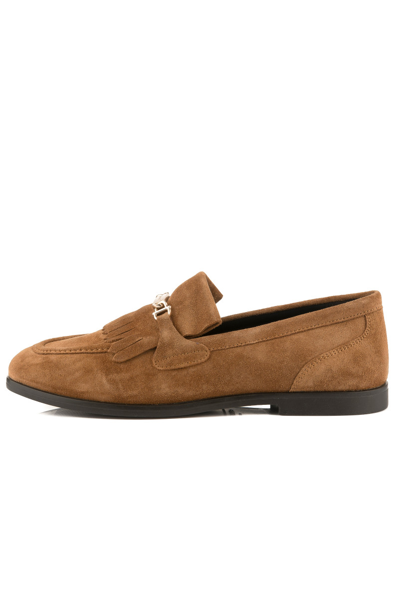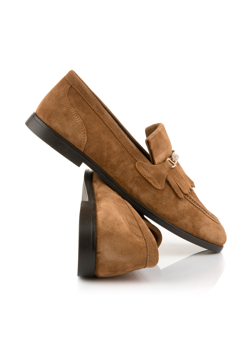 Dámské mokasíny z broušené hovězí usně prémiové kvality. Nadčasový design s kulatou špičkou a tonálním prošíváním doplňuje nízká podrážka z lehkého a flexibilního materiálu. Mokasíny zdobí kovová spona slaté barvy umístěná na přední straně. Celokožený interiér zaručuje maximální komfort při nošení. Dokonale stylová obuv, která bude ozdobou vašeho sportovně-elegantního i formálního outfitu.