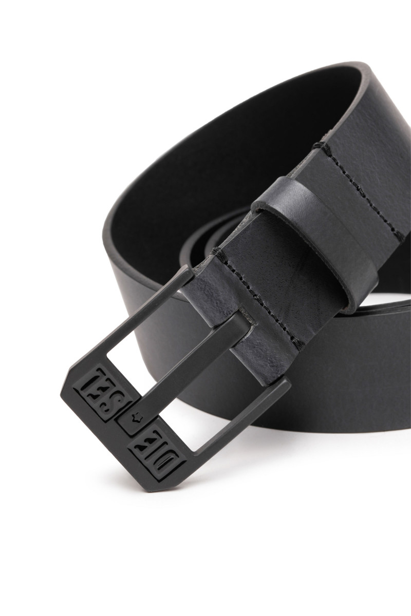 Pánský pásek. Vyroben z hladké kůže. Kovová obdelníková přezka má na okraji nápis Diesel. Originální detail vyryté hvězdy na jehle spony.