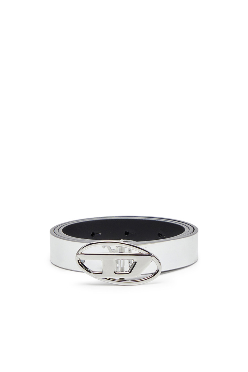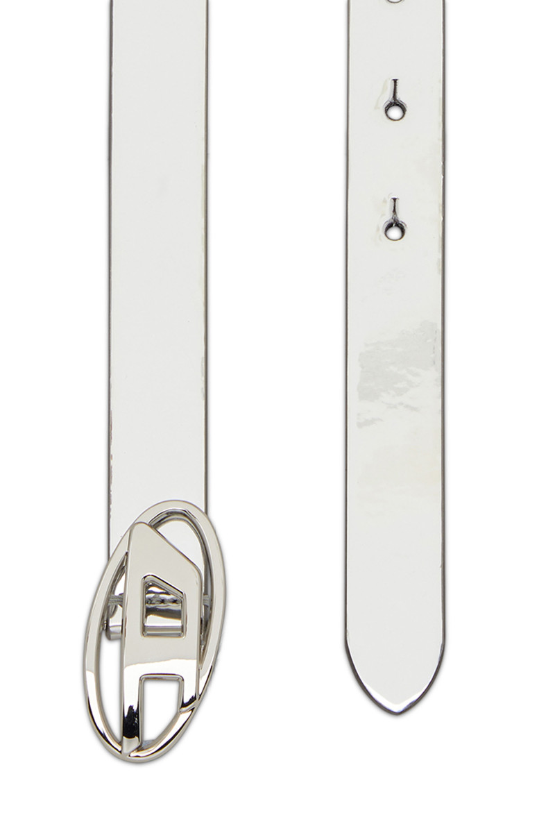 Dámský pásek. Nepřehlédnutelný doplněk se zrcadlově leskne. Je vyroben z kombinace kůže a syntetického materiálu. Opatřen kovovou přezkou ve tvaru ikonického loga oválného písmene D, která do sebe hladce zapadá. Tenký a sofistikovaný průměr popruhu je 20mm.