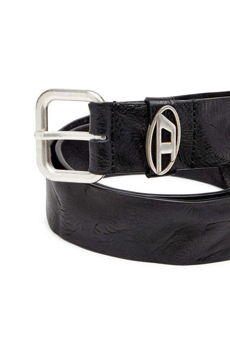Hnědý opasek v univerzálním klasickém designu. Vyroben z pevné kůže s plastickým vrásčitým povrchem s výraznou strukturou. Zapíná se na leštěnou přezku stříbrné barvy. Detail tvoří kovové oválné logo písmene D zdobící smyčku.