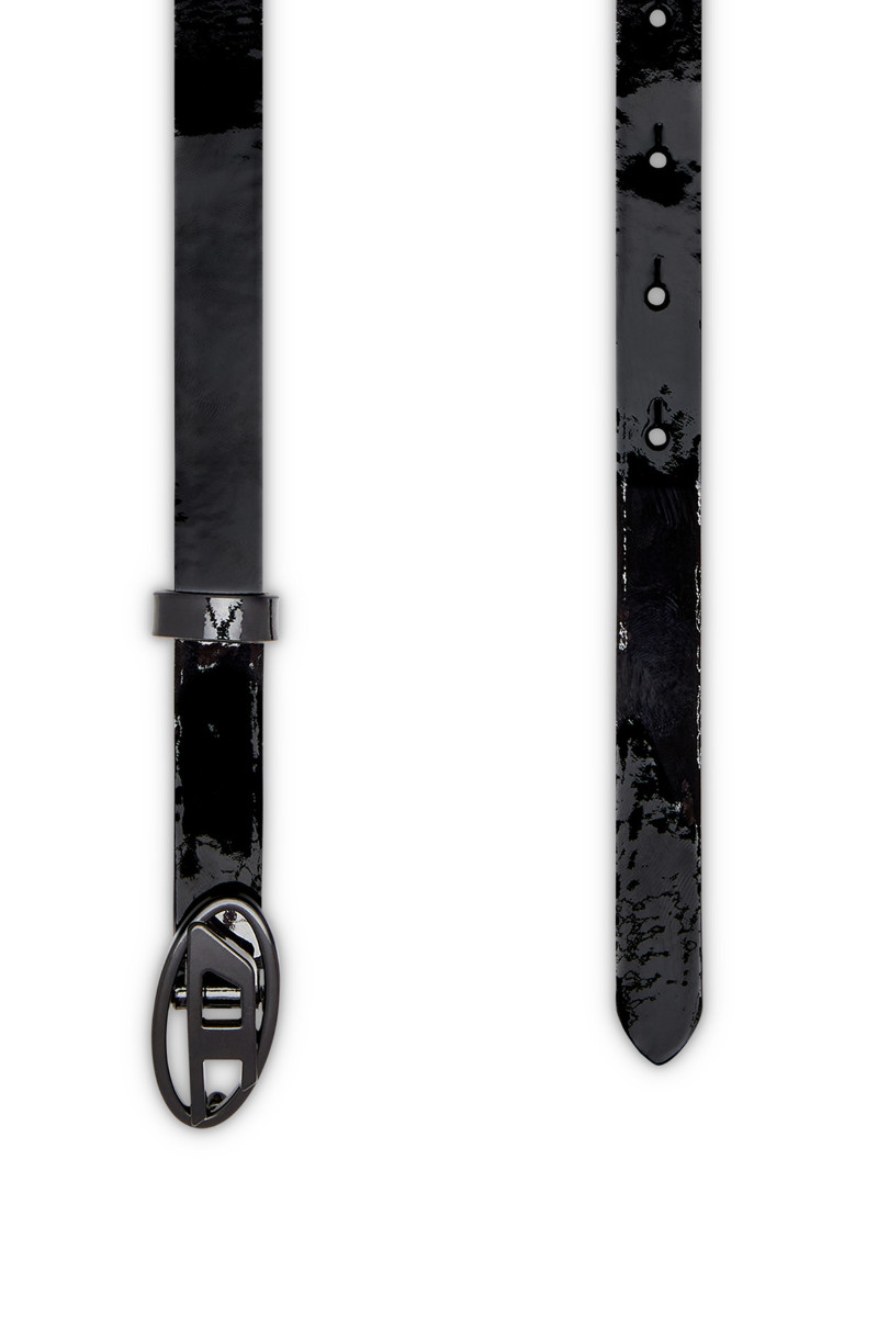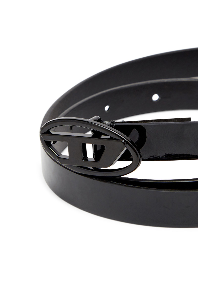 Dámský pásek z lesklé kůže. Monochromatický černý design v kombinaci s lesklým povrchem a zúženým rozměrem umocňuje elegantní a módní styl. Doplněn vykrojenou kovovou přezkou ve tvaru ikonického loga Oval D.