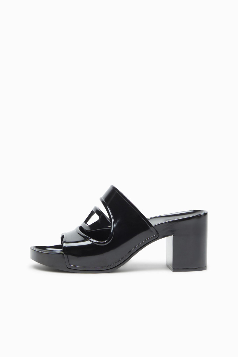 Dámské sandály z lesklé TPU gumy. Tyto odolné a voděodolné boty mají široké pásky vystřižené ve tvaru loga Oval D. Nasazeny na robustních středně vysokých podpatcích. Přilnavá podrážka.