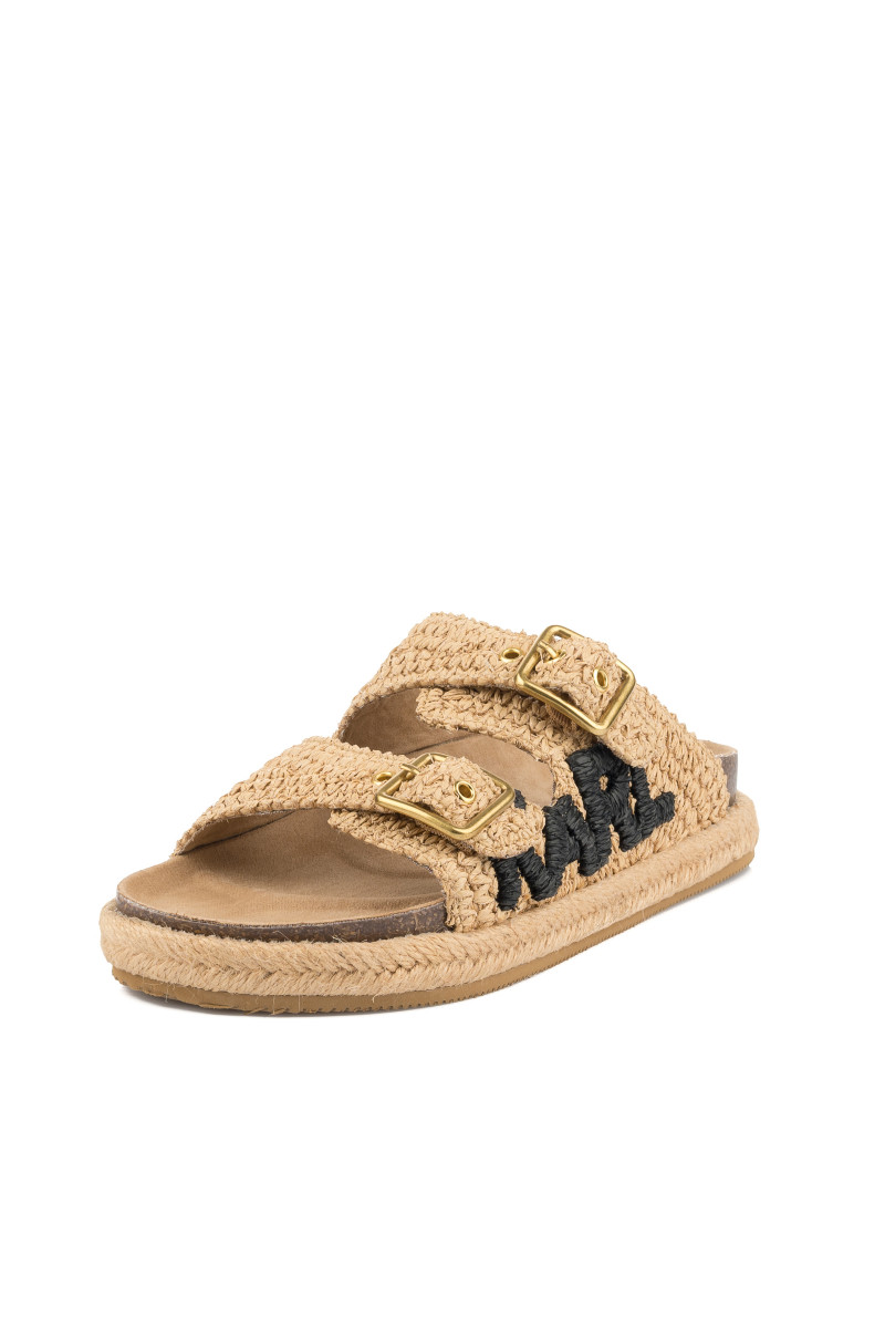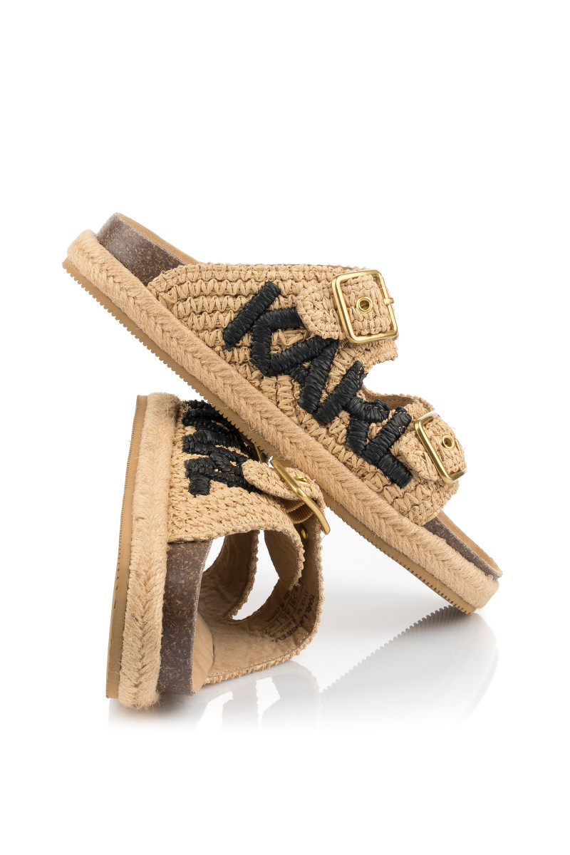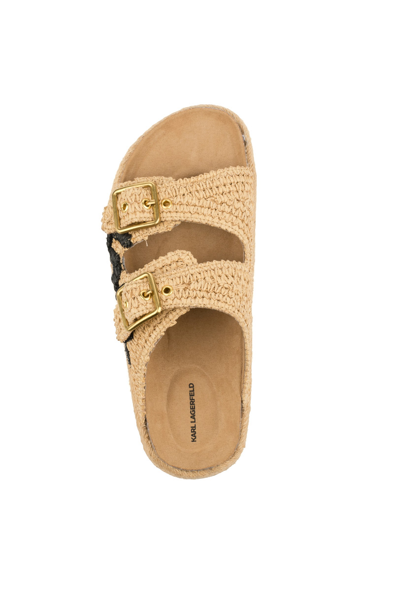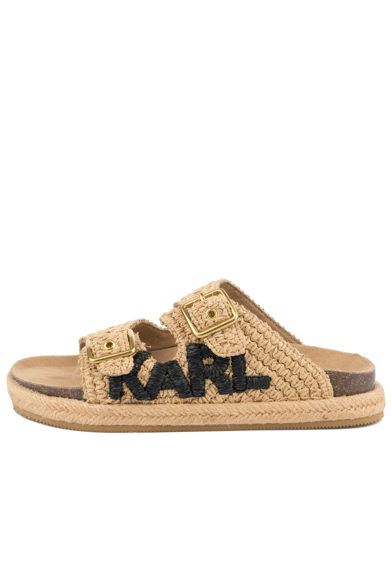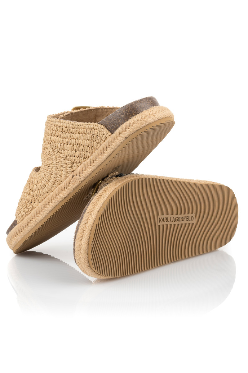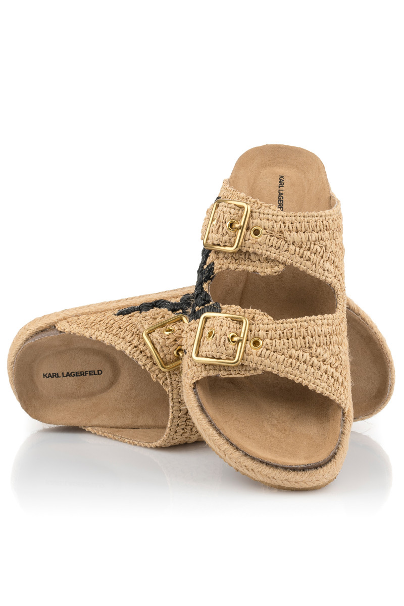 Dámské pantofle s otevřenou špičkou. Přírodní materiál na povrchu spolu s ergonomicky tvarovanou koženou stélkou zaručují maximální pohodlí a příjemný pocit při nošení. Propracovaný design doplňují dva popruhy s nastavitelnou sponou na zapínání a výrazná výšivka loga KARL na vnější straně. Podrážku zdobí efektní prošívání přírodním jutovým vláknem. Nezaměnitelně stylová obuv, která Vám dokonale zpříjemní letní dny.