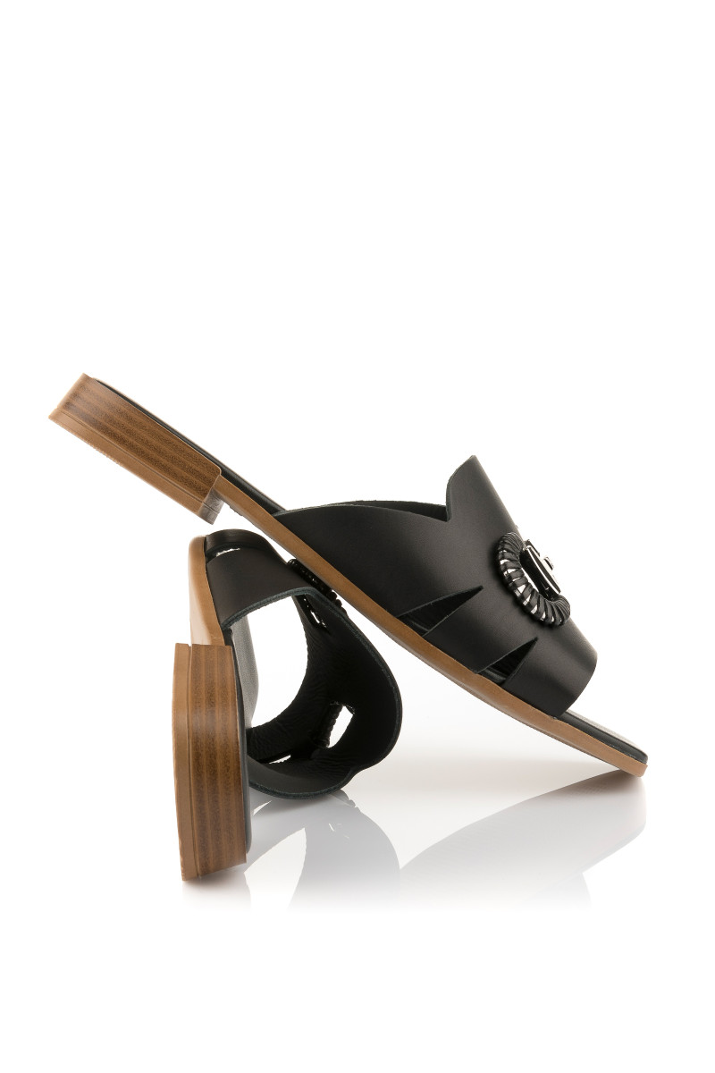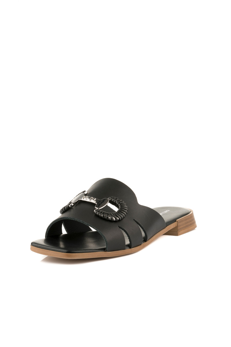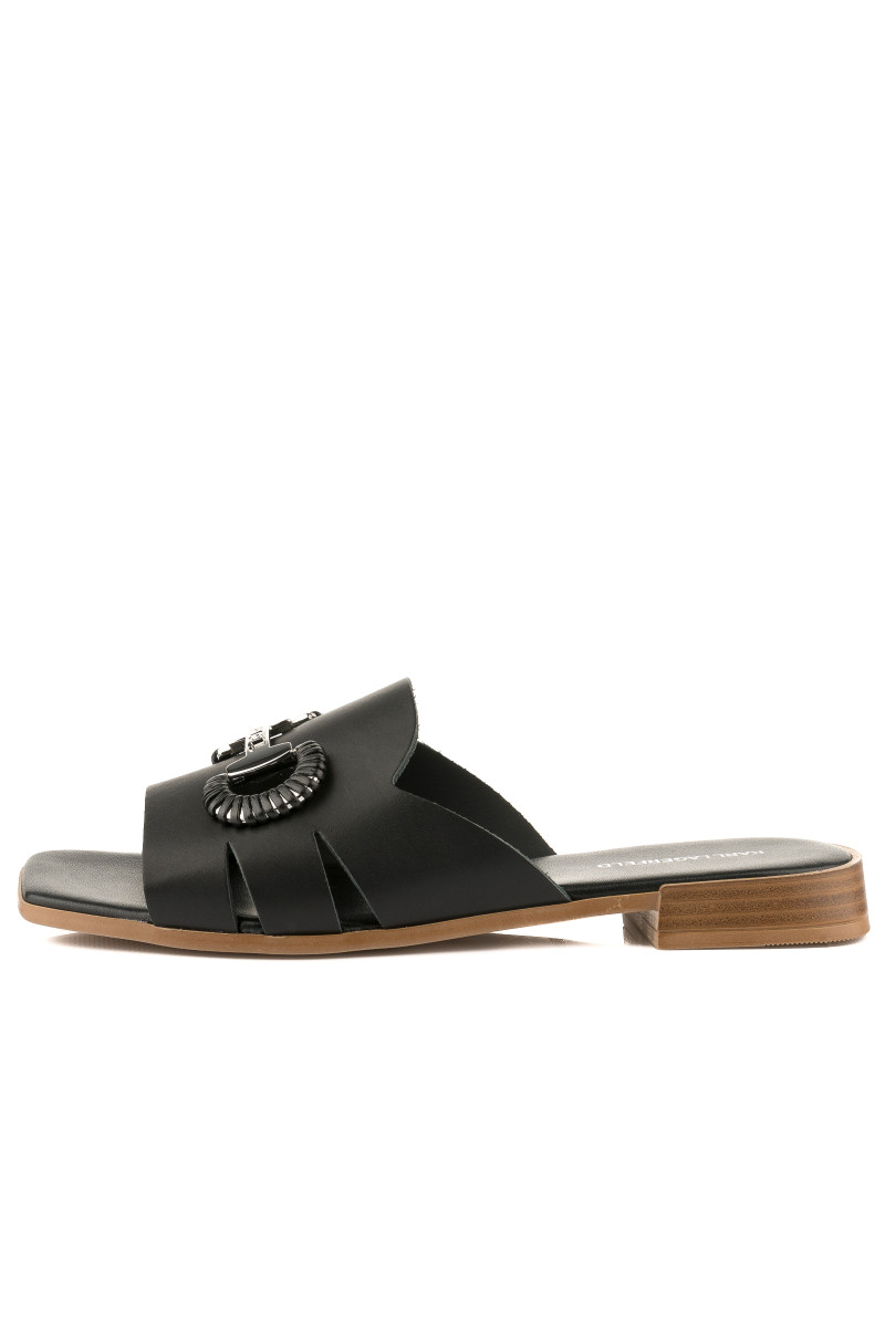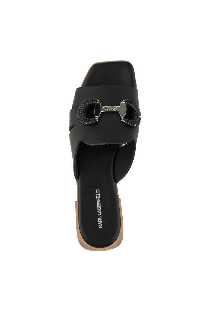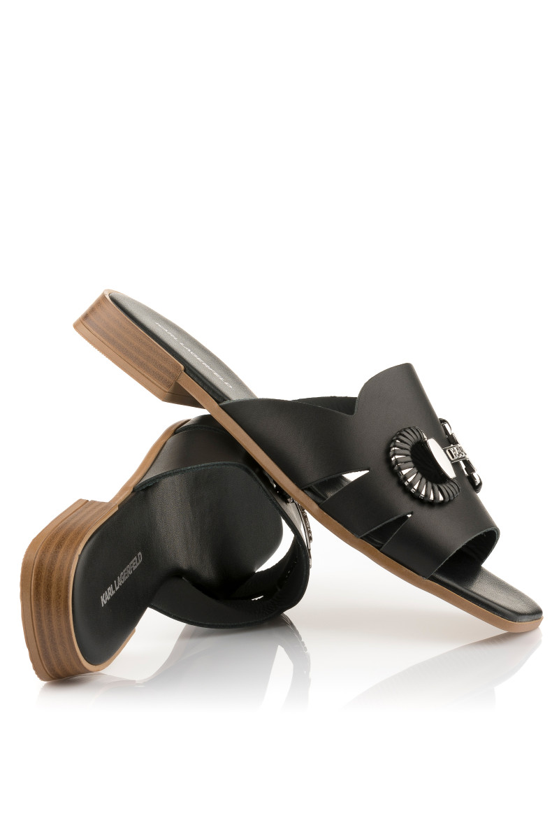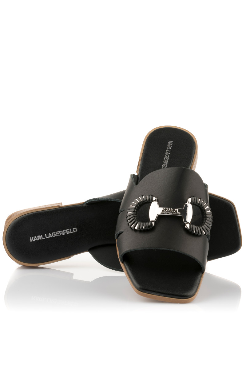 Dámské pantofle z hladké telecí usně prémiové kvality, které si vás získají svým exkluzivním vzhledem a originálními detaily. Jednobarevný design s otevřenou špičkou hranatého tvaru a nízkým podpatkem doplňuje elegantní detail na přední straně zdobený lesklým kovovým logem Karl. Dokonale stylová obuv, která bude ozdobou vašeho letního outfitu.
