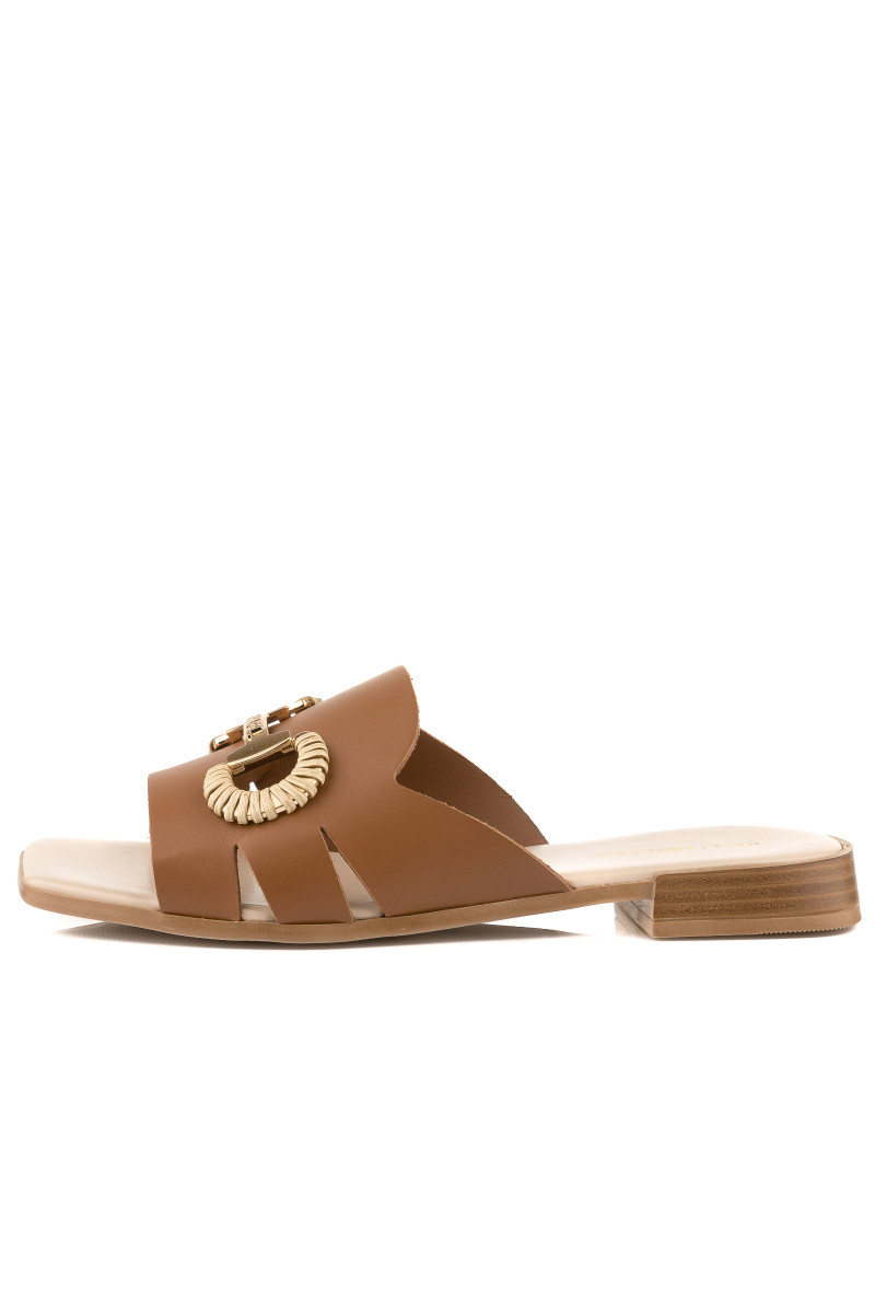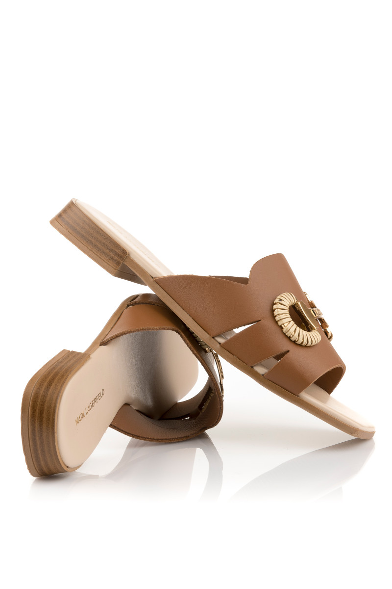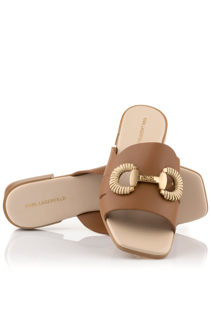 Dámské pantofle z hladké telecí usně prémiové kvality, které si vás získají svým exkluzivním vzhledem a originálními detaily. Jednobarevný design s otevřenou špičkou hranatého tvaru a nízkým podpatkem doplňuje elegantní detail na přední straně zdobený lesklým kovovým logem Karl. Dokonale stylová obuv, která bude ozdobou vašeho letního outfitu.