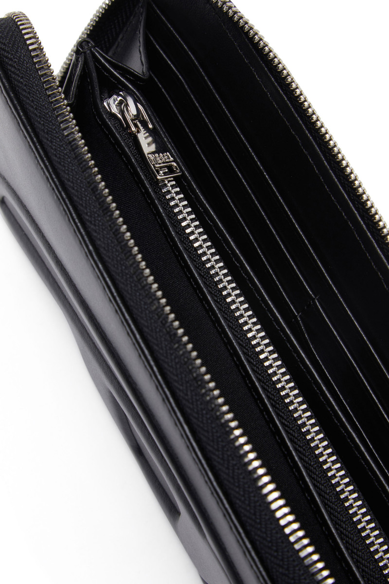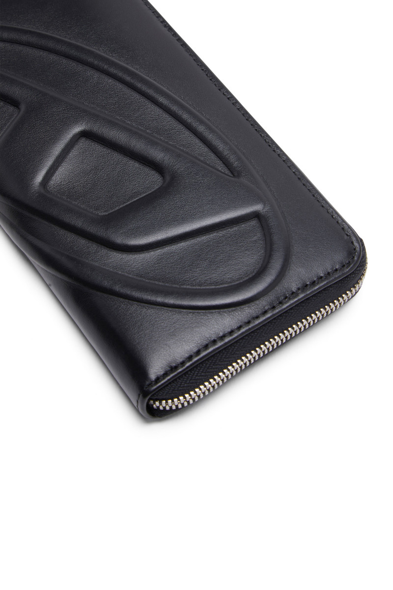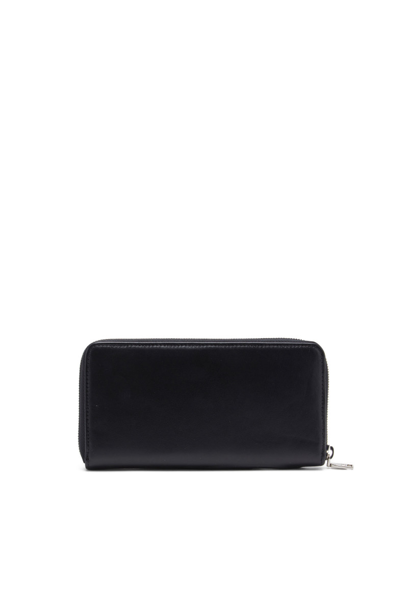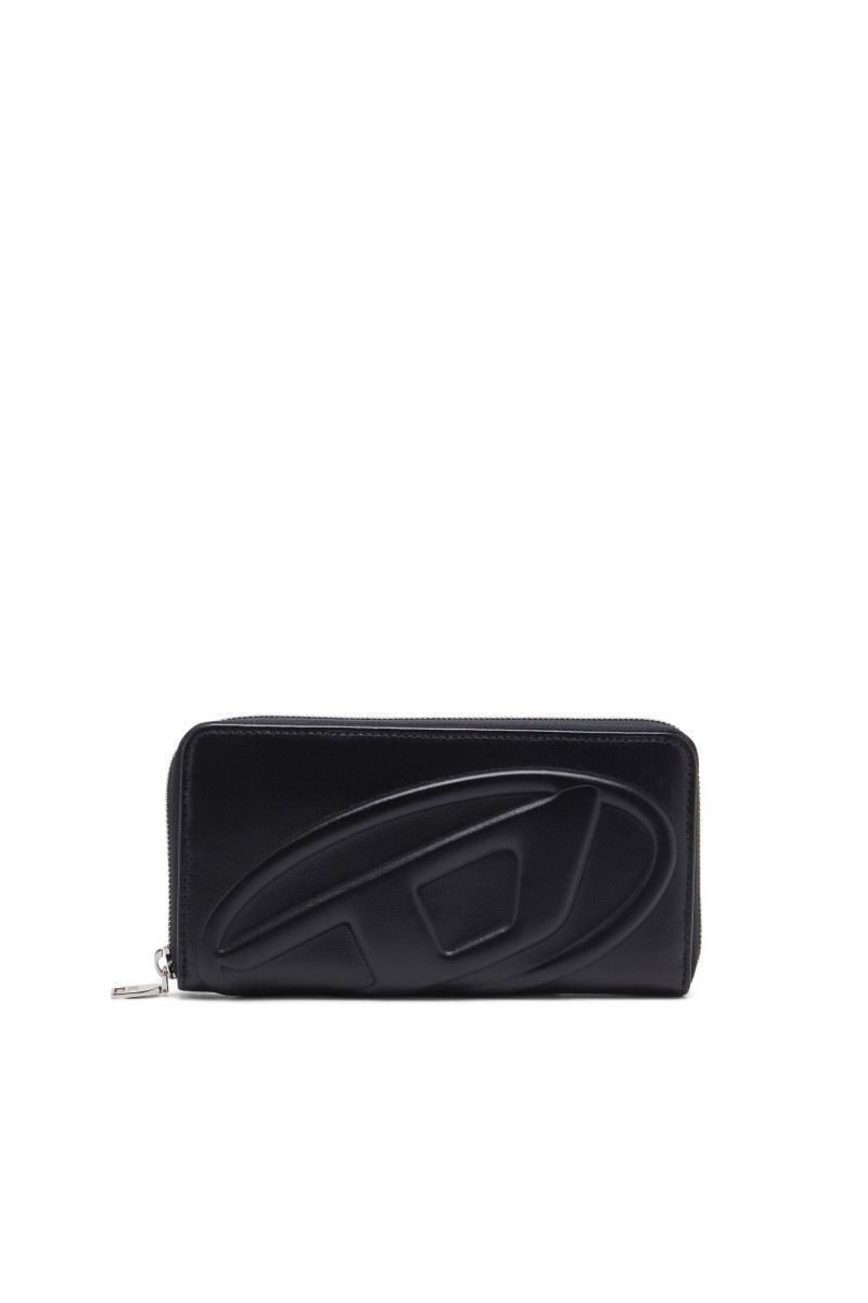 Dámská peněženka ve stylu continental. Vyrobena z hladké hovězí kůže. Odvážný vzhled dotváří výrazné embosované logo ve tvaru ikonického oválného písmene ,,D". Klínový vnitřek má přihrádku na mince uzavíratelnou na zip, dvanáct slotů na karty a prostor pro bankovky.