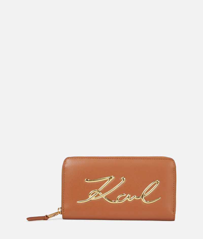 Doplňte svou kolekci luxusních doplňků o tuto hladkou koženou kontinentální peněženku z ikonického sortimentu K/Signature. Peněženka se zapínáním na zip obsahuje několik vnitřních přihrádek na karty a centrální přihrádku na zip pro bezpečné uložení každodenních nezbytností.
