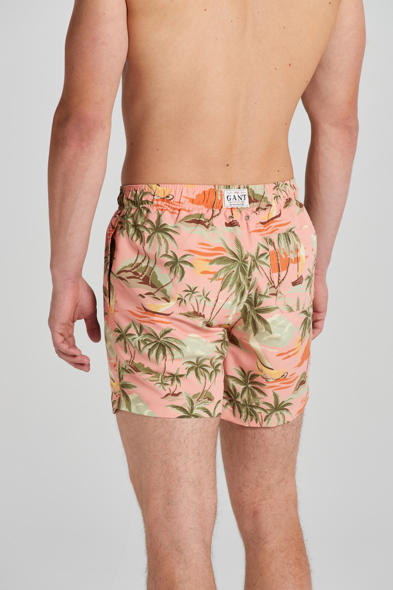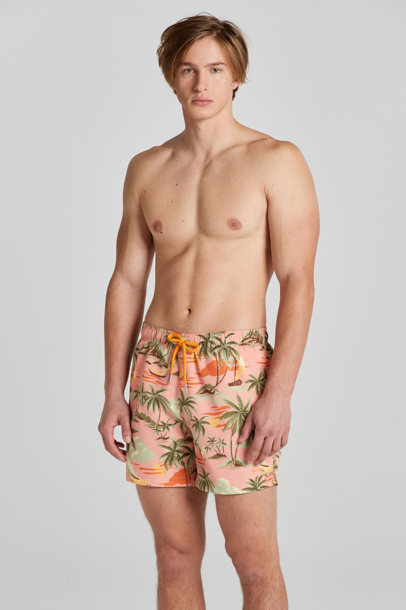 Stylové pánské plavky s limitovaným sezonním vzorem. Volný střih nohavic s délkou do půli stehen, pružný pas s všitou tkaničkou pro případné stažení. Dvě šikmé boční a jedna zadní kapsa. Label s nápisem brandu na zadní části nad efektně provedenými oky, které zamezují naplnění plavek vzduchem. Praktická podšívka ze síťoviny. Pevné, avšak příjemně měkké materiálové složení je odolné vůči oděru, barevně stálé a rychleschnoucí. Velmi komfortní artikl, který se stane nepostradatelnou součástí letní dovolené.